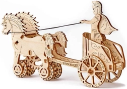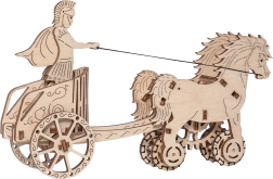 Im Namen des Imperiums. Bausatz eines römischen Wagens mit Doppelgespann, aus Sperrholz gefertigt. Im naturgetreu dargestellten Wagen befindet sich eine detailliert ausgearbeitete Figur eines römischen Reiters. Dank des Aufziehmechanismus kann das Modell fahren; beim Start zeigt es das Aufbäumen des Zug-Doppelgespanns und legt bis zu 1 Meter zurück. Veranstalten Sie Rennen mit weiteren Wooden City Modellen! Ausgestattet mit einer detaillierten Montageanleitung. Hauptmerkmale: 74 präzise ausgeschnittene Teile, niedriger Montagegrad, das fertige Modell kann selbstständig fahren