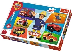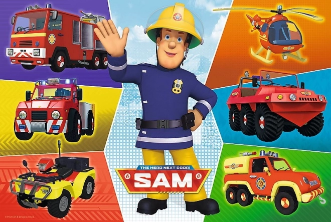 Die bunte Illustration mit Sam und seinen Einsatzfahrzeugen zieht Kinder ins Spiel hinein und motiviert zum Fertigstellen des Bildes.