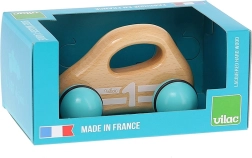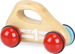 Stilvoller Holzrennwagen aus lackiertem Naturholz mit ergonomischem Griff für leichtes Greifen. Bietet sanftes Rollverhalten, gummierte Räder für leises Fahren und eine robuste Ausführung, geeignet für Kinder ab 12 Monaten und auch als elegante Dekoration.