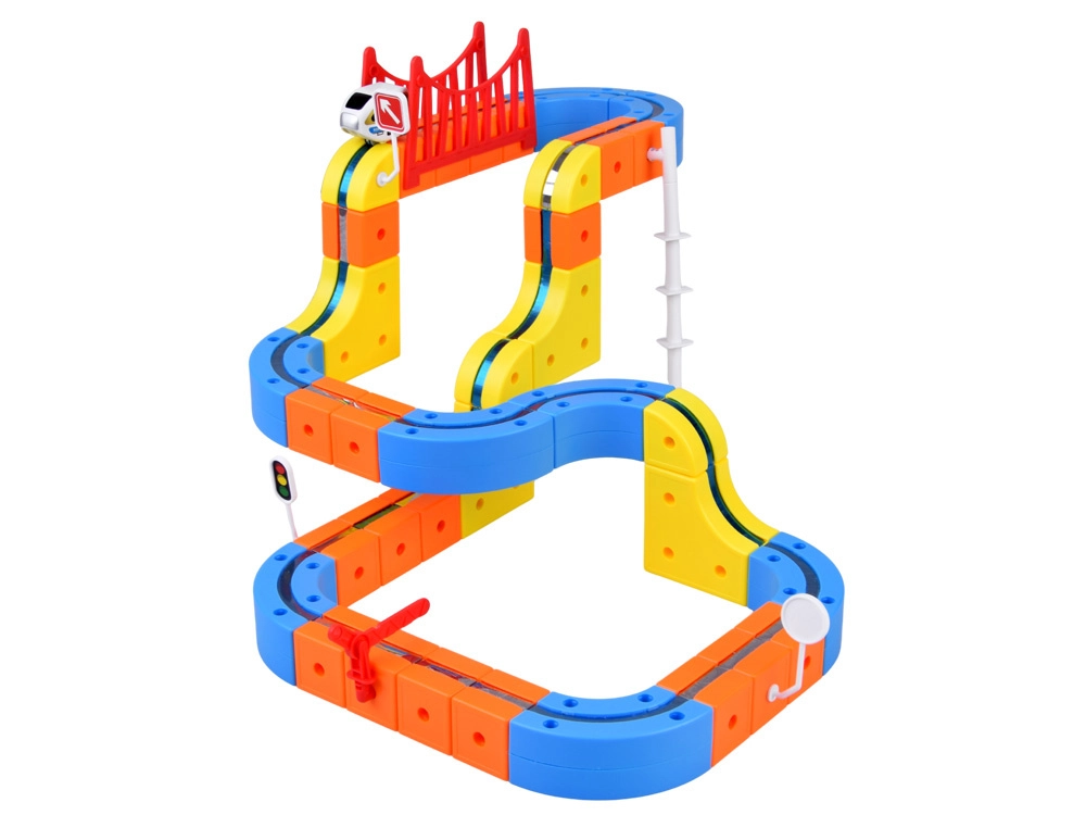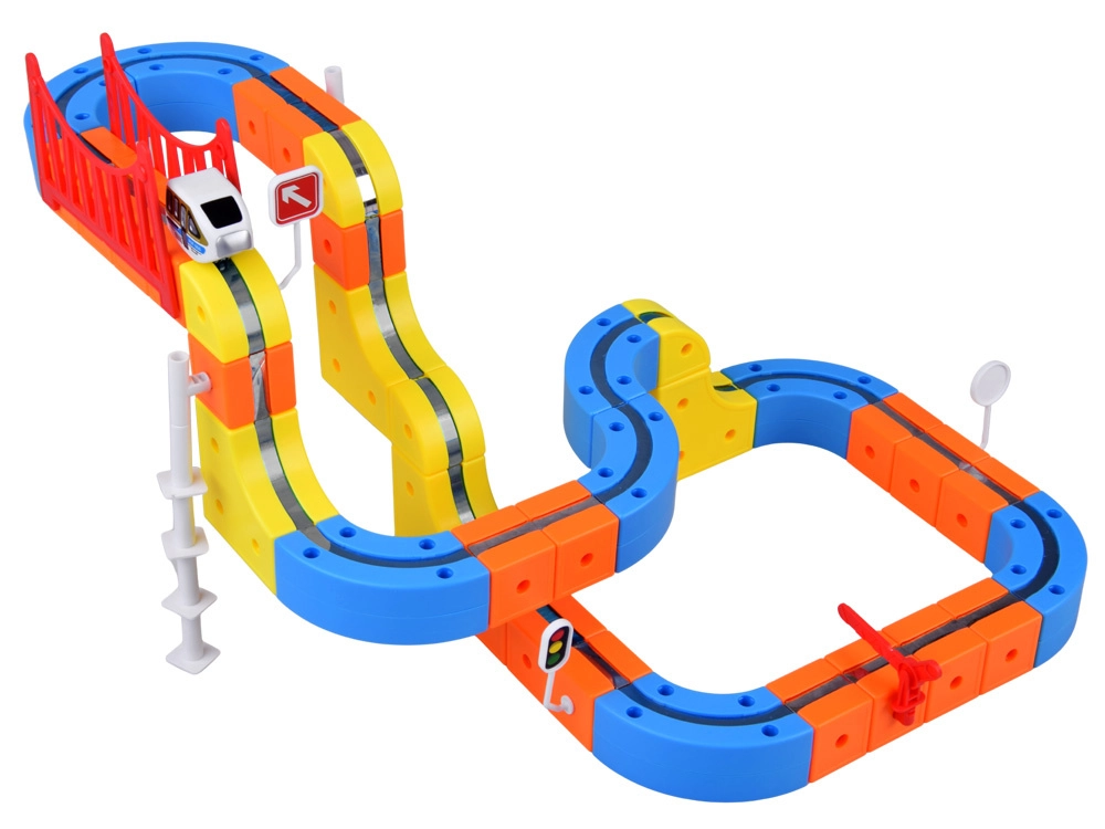 Das umfangreiche Set mit Brücke, Rampe, Verkehrsschildern und dekorativen Aufklebern fördert Kreativität, räumliches Vorstellungsvermögen und logisches Denken. Das Fahrzeug wird einfach per USB aufgeladen – so kann der Spielspaß ohne unnötige Pausen weitergehen.