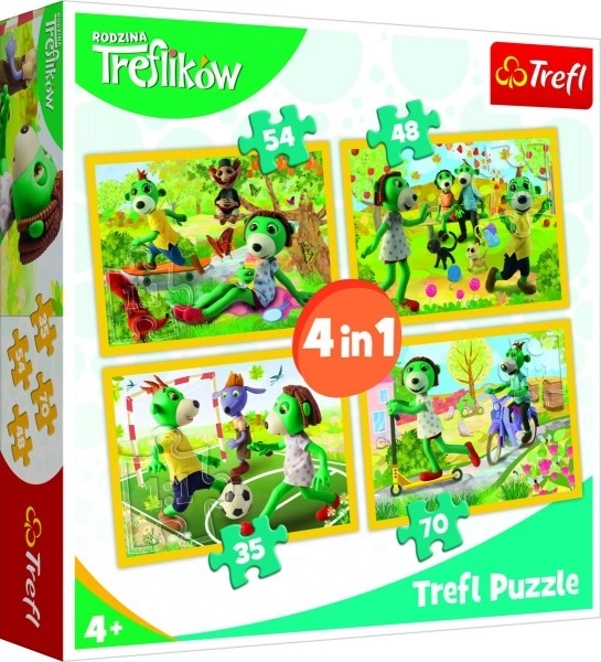 Machen Sie Kindern eine Freude mit dem farbenfrohen Set aus 4 unabhängigen Puzzles mit Motiven der beliebten Serie Treflik-Familie. Jedes Bild hat eine unterschiedliche Anzahl an Teilen, sodass sowohl Anfänger als auch etwas Fortgeschrittene auf ihre Kosten kommen. Dank des speziellen Papiers, das das Licht reflektiert, lassen sich die Teile besser unterscheiden und das Puzzeln wird angenehmer.