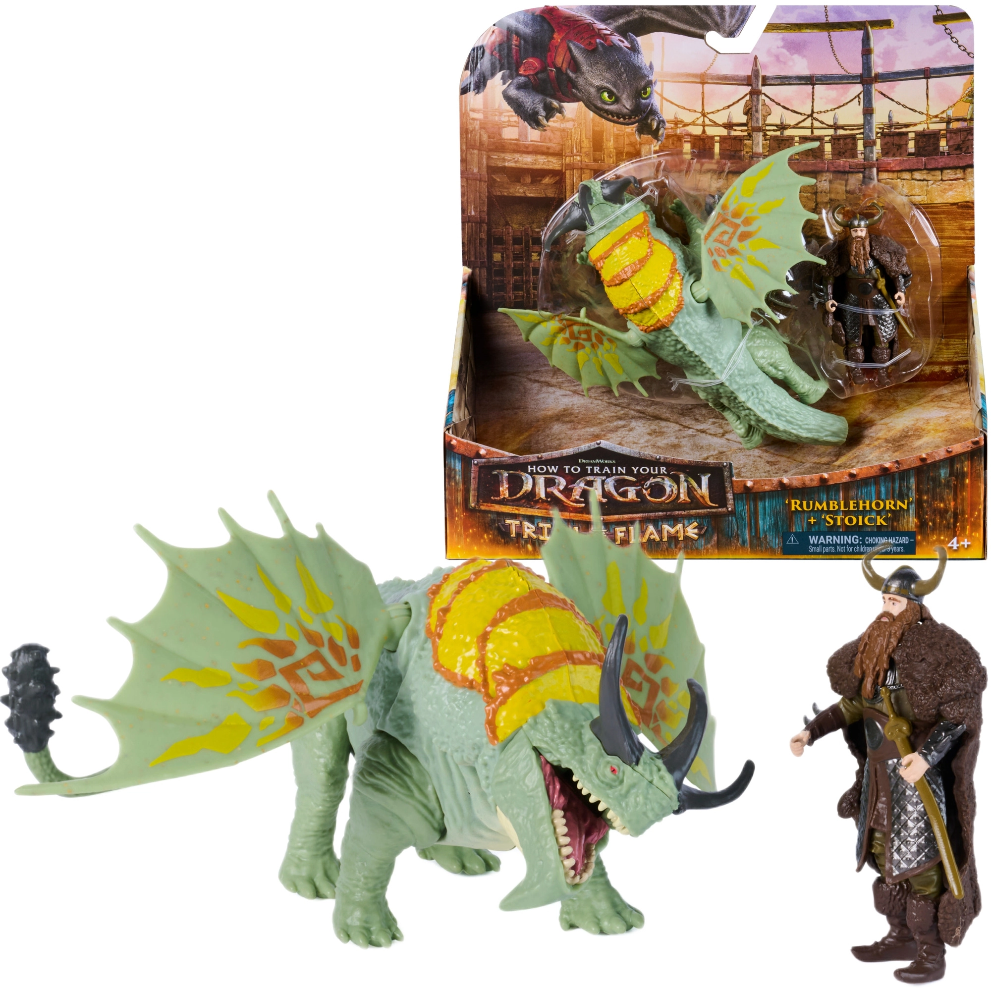 Treten Sie ein in die Welt der Wikinger und Drachen. Der grün-türkise Drache Rumblehorn mit gemusterten Membranflügeln und markanten Hörnern begeistert durch seine Ausführung, während Stoick in ikonischer Rüstung bereit für den Einsatz ist. Die Figuren erfreuen Sammler und Kinder, die Actiongeschichten und das Nachspielen von Szenen aus dem Film How to Train Your Dragon lieben.