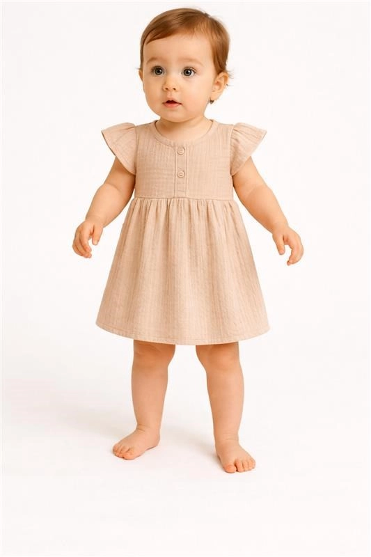 Dieses Mädchenkleid aus feinem Musselin begeistert durch seine Leichtigkeit und die luftige Silhouette. Der A-Linien-Schnitt mit schön gerafftem Rock sorgt für Bewegungsfreiheit, während das vordere Knöpfen das An- und Ausziehen erleichtert. Die beige Farbe lässt sich leicht kombinieren und passt sowohl für den Alltag als auch für festliche Anlässe.