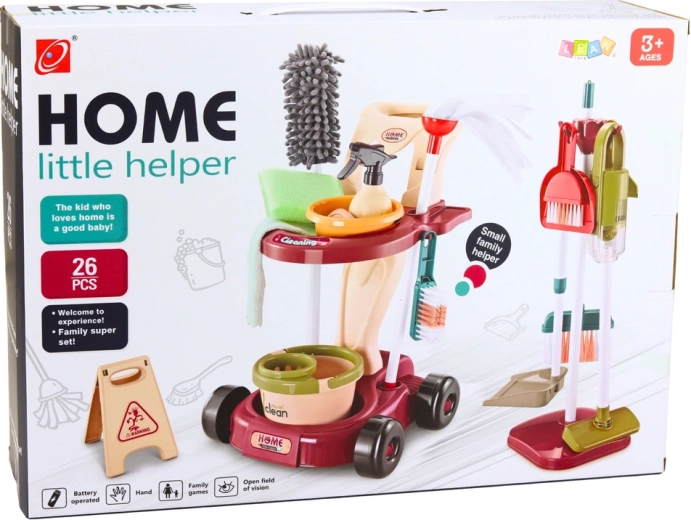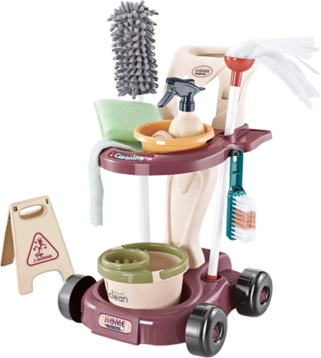 Entdecken Sie das komplette Reinigungsset für Kinder, das alltägliche Tätigkeiten in ein spielerisches Erlebnis verwandelt. Kinder können dank realistischer Zubehörteile kehren, wischen und „staubsaugen“, was Bewegungskoordination und Selbstständigkeit fördert. Alle Teile lassen sich leicht auf dem praktischen Wagen oder Ständer verstauen – so bleibt während des Spielens Ordnung.