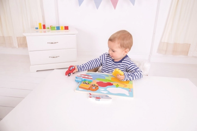 Lustiges Holz-Steckpuzzle mit Fahrzeugen für die Kleinsten. Enthält 5 große Teile mit Griff, die Kinder leicht in die richtigen Öffnungen einsetzen. Fördert die Feinmotorik, Koordinationsfähigkeiten, das Erlernen von Formen und Farben sowie den Wortschatz. Hergestellt aus hochwertigem Holz und entspricht den europäischen Sicherheitsnormen.