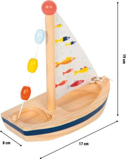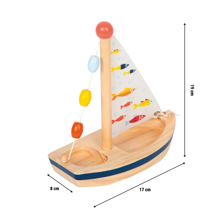 Dieses stilvolle Holzsegelboot bringt eine Extraportion Fantasie in jedes Bad und in sommerliche Wasserspiele. Natürliches Holz wird durch ein bedrucktes Stoffsegel mit fröhlichen Fischen und bunte Perlen am Mast ergänzt, die Kinder ansprechen und die Sinneswahrnehmung fördern. Das Spielzeug ist leicht, liegt gut in kleinen Händen und lässt sich nach dem Wasserspaß einfach abtrocknen, damit es für die nächste Fahrt bereit ist.