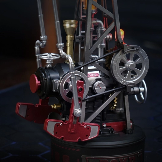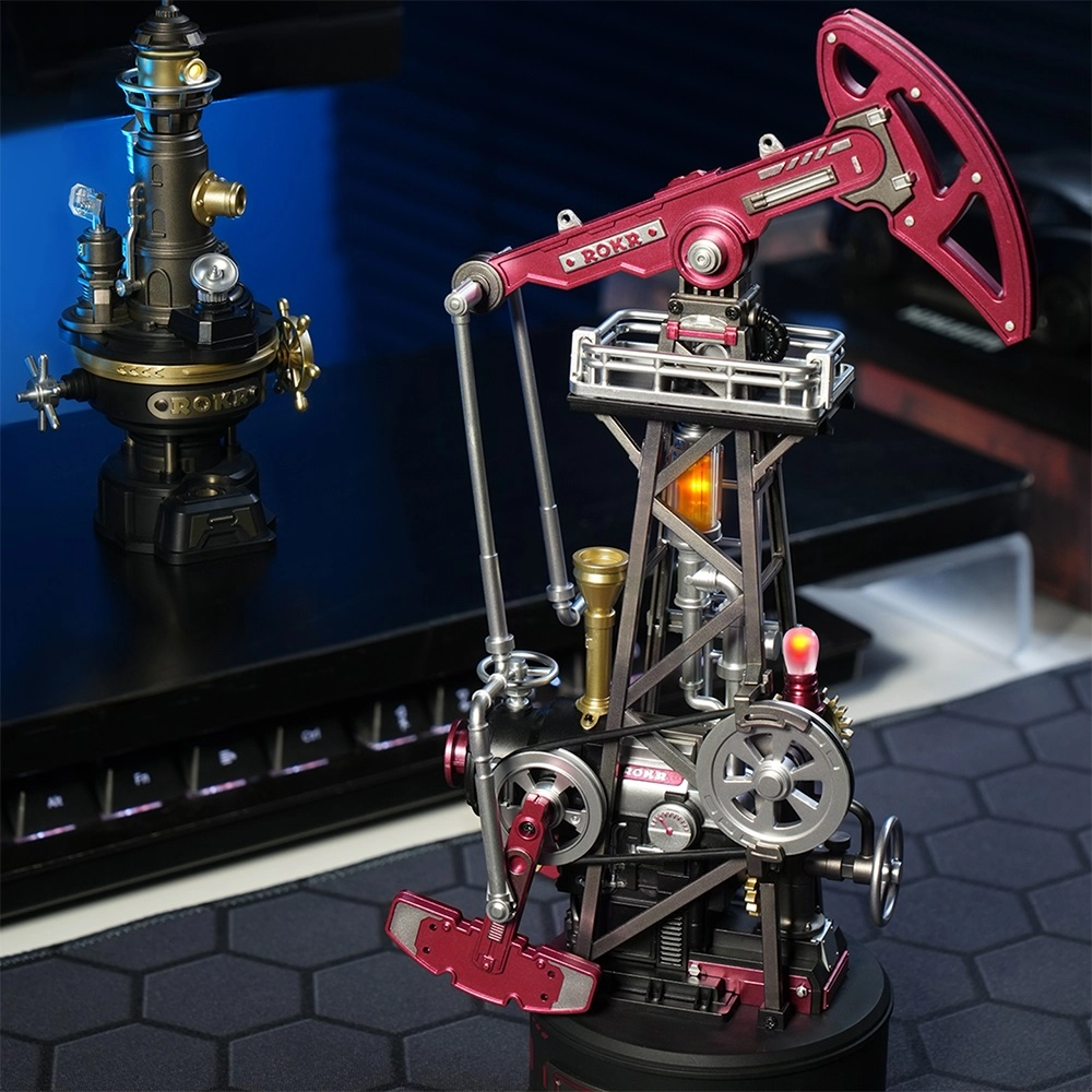 Dieses mechanische Puzzle, inspiriert von der historischen Fördermaschine Pumpjack, bringt Technik direkt auf Ihren Tisch. Ein ausgeklügeltes System aus Zahnrädern, Kurbelmechanismus, Gegengewicht und Kolben sorgt für einen sanften und authentischen Lauf. Der LED-Effekt im „Dampfkessel“ simuliert elegant die Verbrennung und betont die industrielle Atmosphäre.