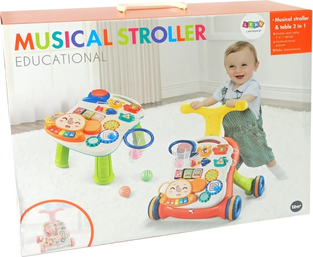 Entdecken Sie ein vielseitiges Spielzeug, das sich dem Tempo Ihres Kindes anpasst. Der Lauflernwagen unterstützt das Üben des selbstständigen Laufens, während der Spieltisch vielseitige Anreize zum Lernen und Spielen bietet. Das abnehmbare Panel mit farbigem Piano (Do–Re–Mi–Fa–So), drehbaren Zahnrädern und geometrischen Formen motiviert zum Entdecken, Drücken und Sortieren.