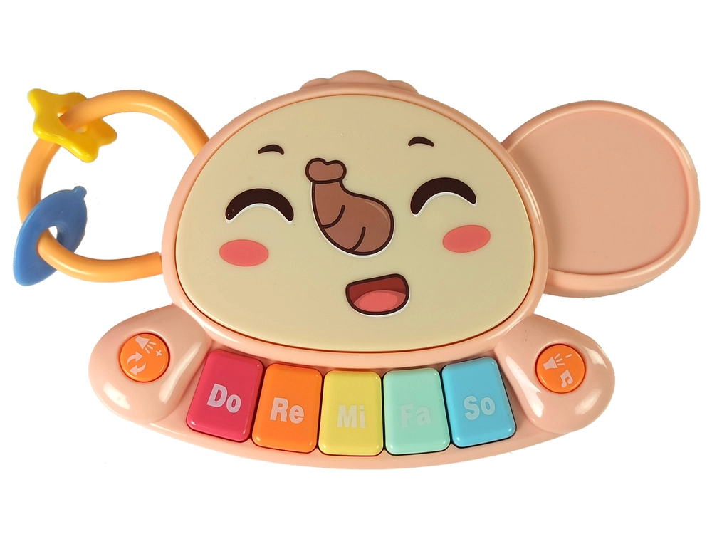 farbiges Piano (Do–Re–Mi–Fa–So), 3 Zahnräder, geometrische Formen an Schnüren, Korb und Bälle, drehbare Würfel