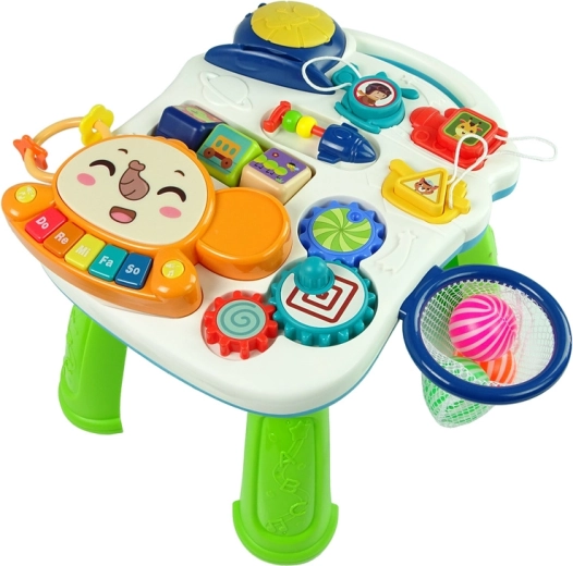 Das edukative Panel fördert die Feinmotorik, die Hand-Auge-Koordination sowie die Wahrnehmung von Farben und Formen. Kinder genießen musikalische Aktivitäten, Formensortieren und ihre ersten Versuche, in den Korb zu werfen. Alle Elemente sind so gestaltet, dass sie zum Entdecken motivieren und die natürliche Entwicklung des Kindes unterstützen.