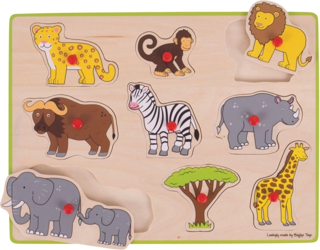 Das Holz Einlegepuzzle Safari wurde entwickelt, um Kindern dabei zu helfen, Geschicklichkeit, sensorische Fähigkeiten und Konzentration zu entwickeln. Mit seiner Hilfe lernen Kinder leicht, verschiedene Formen und Tiere aus der Safari zu erkennen.