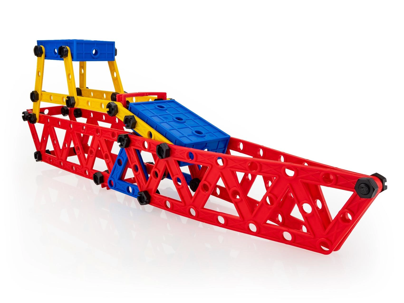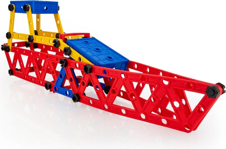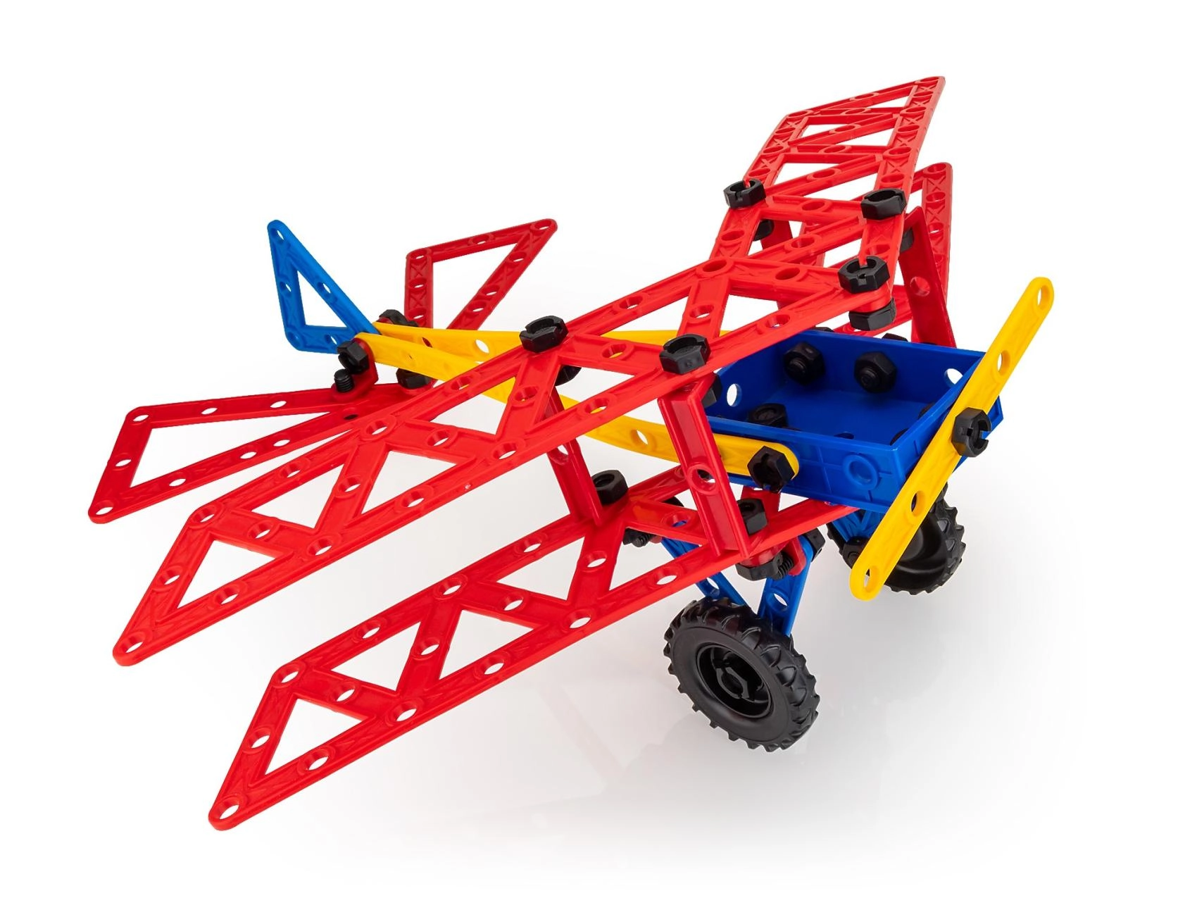 Dank der variablen Teile lassen sich die unterschiedlichsten Konstruktionen erstellen – vom Doppeldecker über Fahrzeuge bis hin zu Schiffen. Große perforierte Paneele, Verbinder und Träger lassen sich leicht kombinieren, wodurch der Baukasten sowohl für Einsteiger als auch für kleine Konstrukteure geeignet ist, die die Prinzipien der Mechanik und grundlegende physikalische Phänomene erforschen möchten.