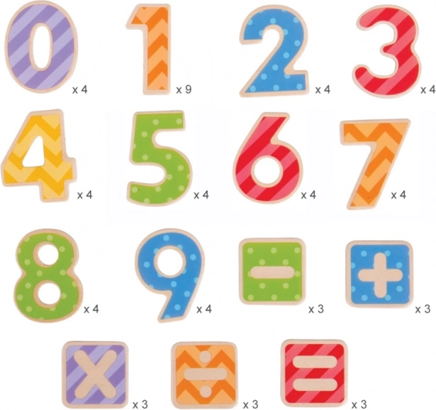 In diesem Set finden Sie insgesamt 56 Teile, darunter die Zahlen 0 bis 9 und verschiedene mathematische Operatoren. Die magnetischen Zahlen sind perfekt für Tafeln geeignet, was es Kindern ermöglicht, einfach Rechnungen und Geschichten mit Zahlen zu erstellen. Sie helfen, Geschicklichkeit und Konzentration zu entwickeln und ihre Verwendung ist sicher.