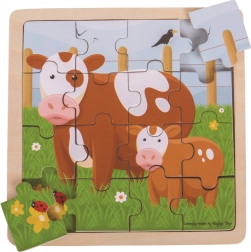 Die fürsorgliche Kuh lädt zusammen mit ihrem Kälbchen die Kinder auf die grüne Wiese ein – es erwartet sie entspanntes Puzzeln, das die Feinmotorik und Geduld fördert. Die Teile sind stabil, glatt verarbeitet und auf kleine Hände zugeschnitten, sodass sie sich gut handhaben lassen. Dank des Formats 18 × 18 × 1 cm eignet sich das Puzzle für zu Hause und unterwegs.
