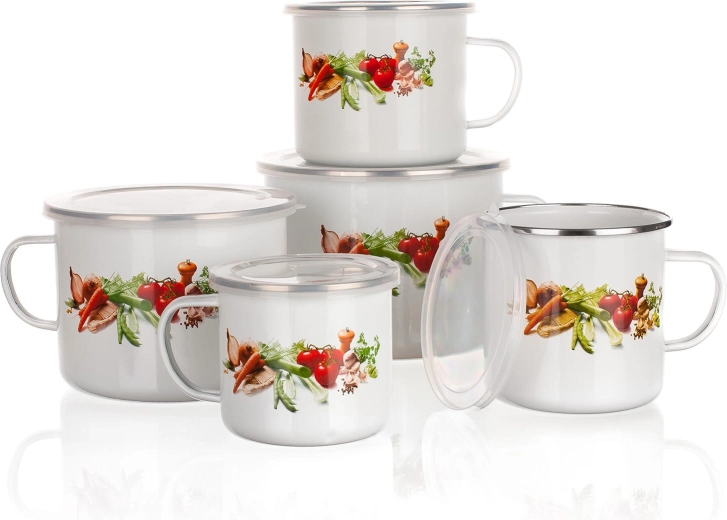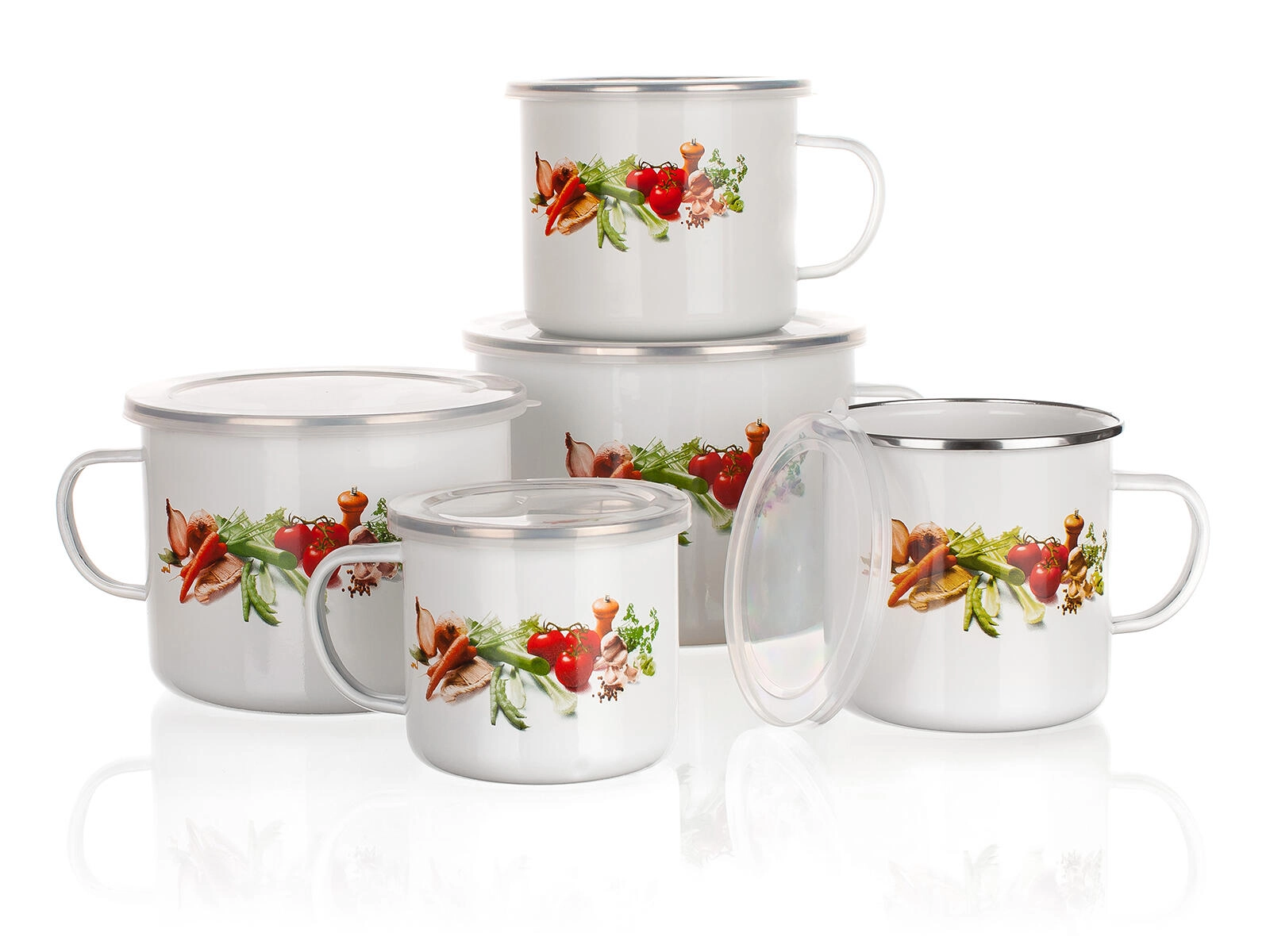 Dieser Emaillebecher mit weißer Oberfläche und fröhlichem Gemüsedekor überzeugt durch seine Widerstandsfähigkeit, sein geringes Gewicht und die einfache Pflege. Der praktische Kunststoffdeckel hilft, das Getränk länger warm zu halten, schützt den Inhalt beim Transport und eignet sich auch für die kurzfristige Aufbewahrung von Getränken oder Speisen.