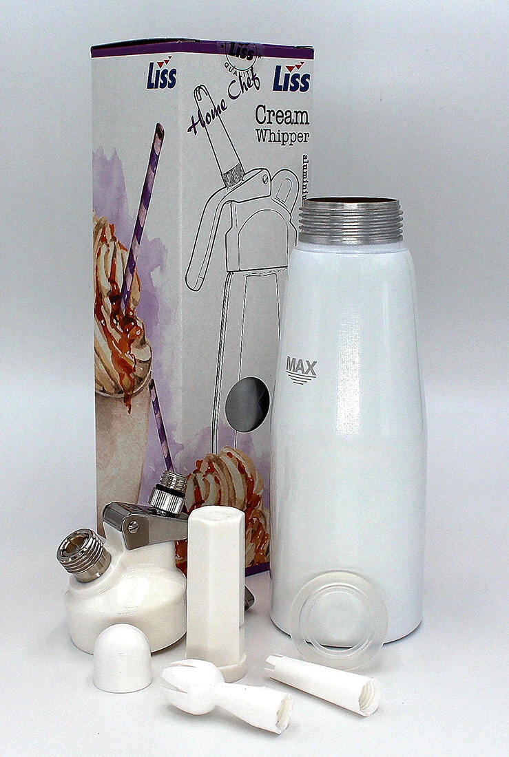 Entdecken Sie den Komfort der hausgemachten Sahnezubereitung mit dem LISS Home Chef Sahnespender mit 0,5 l Volumen. Der Aluminiumkörper mit weißem Lack und einer Innenbeschichtung sorgt für lange Lebensdauer und einfache Pflege. Die empfohlene Sahnemenge von 250–400 ml bietet optimale Fluffigkeit, das maximale Mischvolumen beträgt 500 ml.