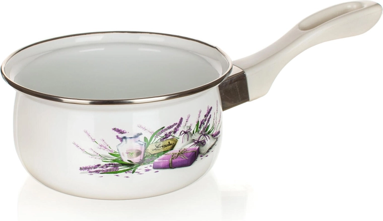Elegante emaillierte Stielkasserolle mit dem Motiv Lavender – ideal zum täglichen Kochen und Aufwärmen. Bietet ein Fassungsvermögen von 0,65 l, einen Durchmesser von 14 cm und einen langen Griff für sicheres Handling. Dank der robusten Emaille-Beschichtung und der weißen Glasur mit Lavendel-Dekor ist sie praktisch und stilvoll. Geeignet für alle Kochfeldarten.