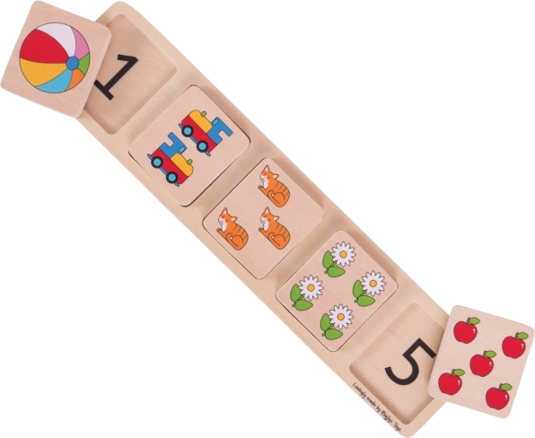 Dieses massive Holzpuzzle bringt Kindern bei, die Anzahl der Abbildungen der richtigen Zahl zuzuordnen und baut grundlegende numerische Fähigkeiten auf. Große Teile mit klaren Motiven (Ball, Zug, Katzen, Blumen, Äpfel) laden zum wiederholten Spielen ein, erweitern den Wortschatz und fördern das Erkennen von Formen und Farben.