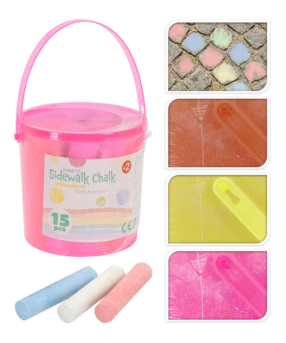 Eine fröhliche Farbpalette regt die Fantasie an und unterstützt die Feinmotorik. Kinder können Bilder und Muster gestalten oder Spiele wie Himmel-und-Hölle und Parcours zeichnen. Der Eimer aus robustem Kunststoff erleichtert das Aufbewahren und Transportieren, sodass das Set für jedes Abenteuer im Freien bereit ist.