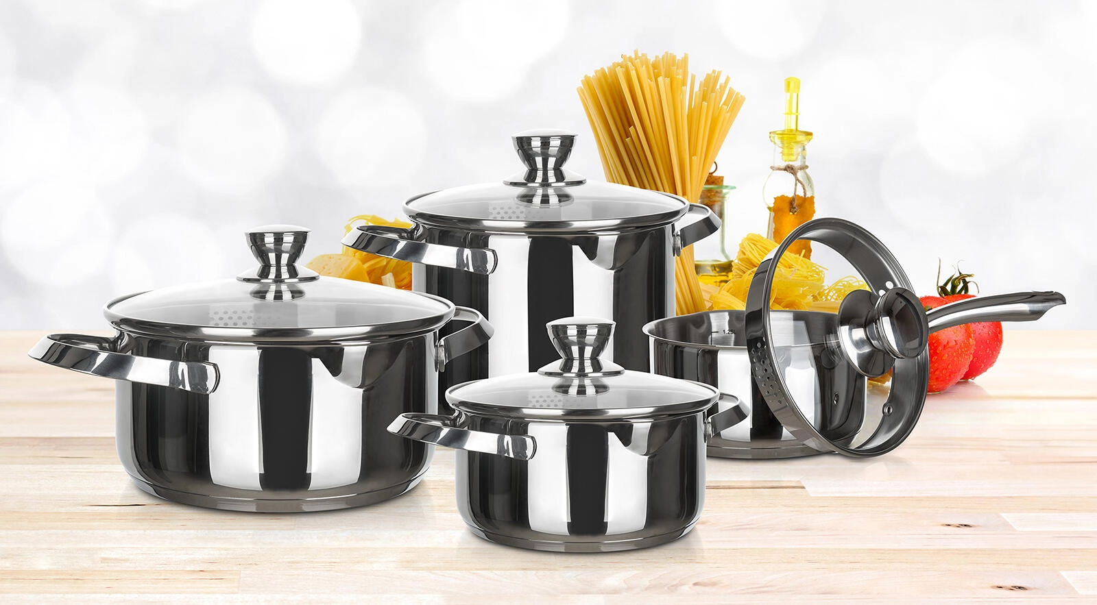 Das EMBASSY-Set kombiniert hochwertigen Edelstahl mit durchdachten Details für komfortables und sicheres Kochen. Glasdeckel mit Dampföffnungen erleichtern das Abgießen, Ausgießer an den Töpfen minimieren Verschütten und die innenliegenden Messskalen helfen beim genauen Abmessen von Flüssigkeiten. Die glänzende Oberfläche innen und außen sorgt für ein modernes Erscheinungsbild und ist leicht zu reinigen.