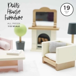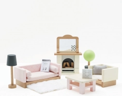 Das Set enthält 19 Teile: ein Sofa und einen Sessel mit Textilkissen, einen Couchtisch, einen Kamin mit Holzscheiten und Spiegel, einen Teppich, eine Topfpflanze und eine Lampe. Größenmäßig passend für Puppenhäuser von Le Toy Van. Weitere Zubehörteile der Daisylane-Reihe sind auf unserer Website erhältlich.