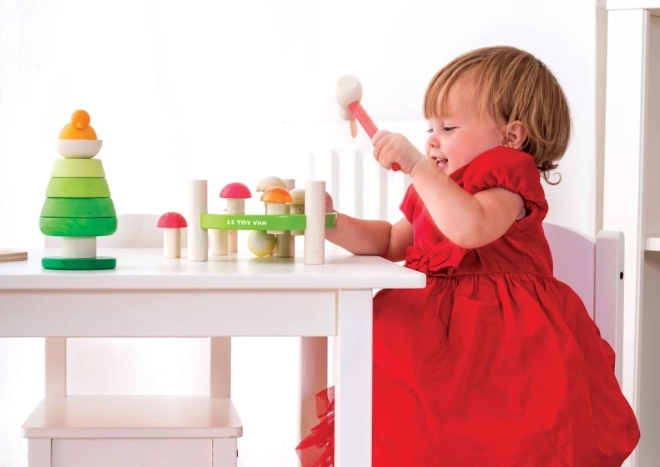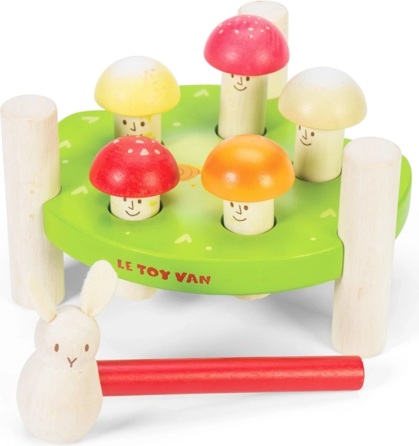 Das Spielzeug fördert motorische Fähigkeiten, indem die Kinder den Hammer zum Einschlagen der Fliegenpilze benutzen. Buntes Design und Formen stimulieren die visuelle Wahrnehmung.