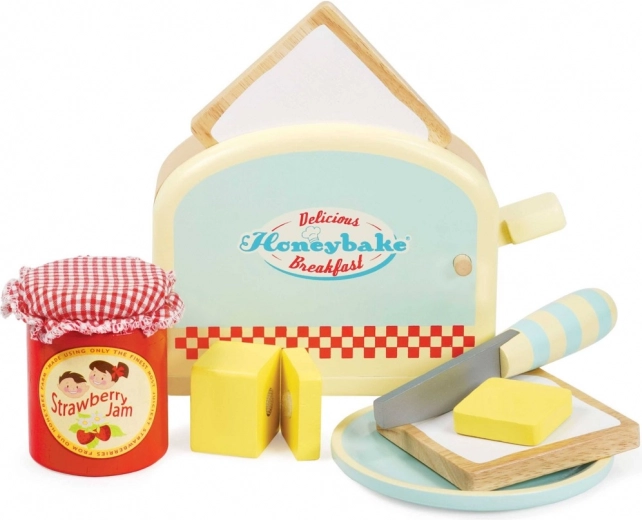 • Komplettes Frühstücksset: Toaster mit Federmechanismus, 2 Brotscheiben, Butter mit Klettverschluss, Messer, Teller und Marmelade.