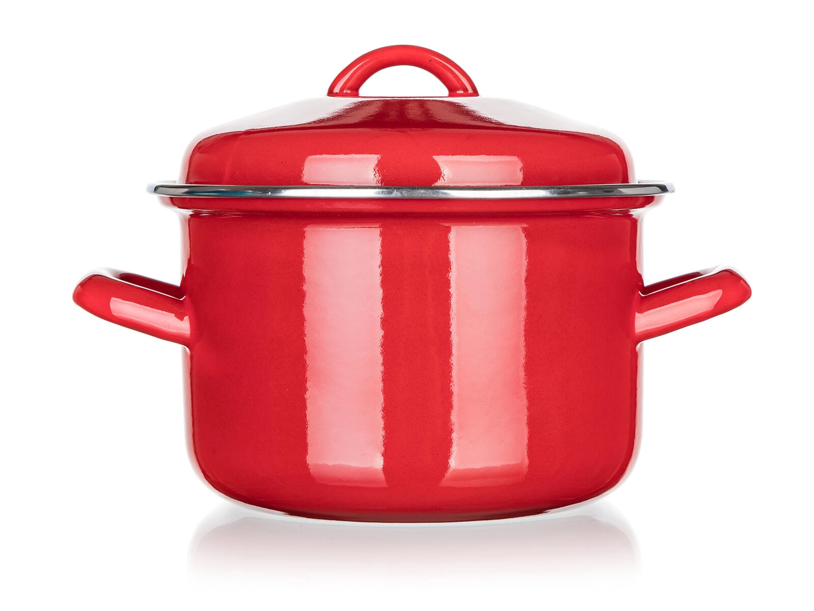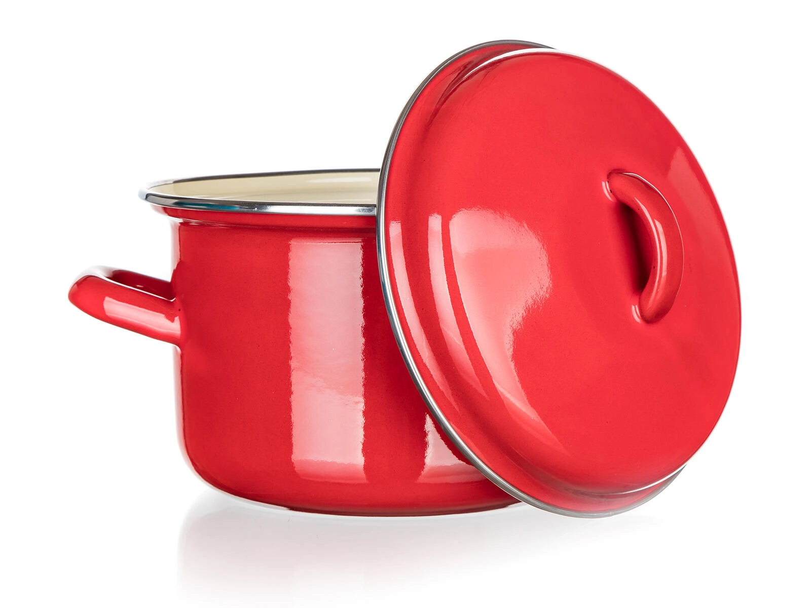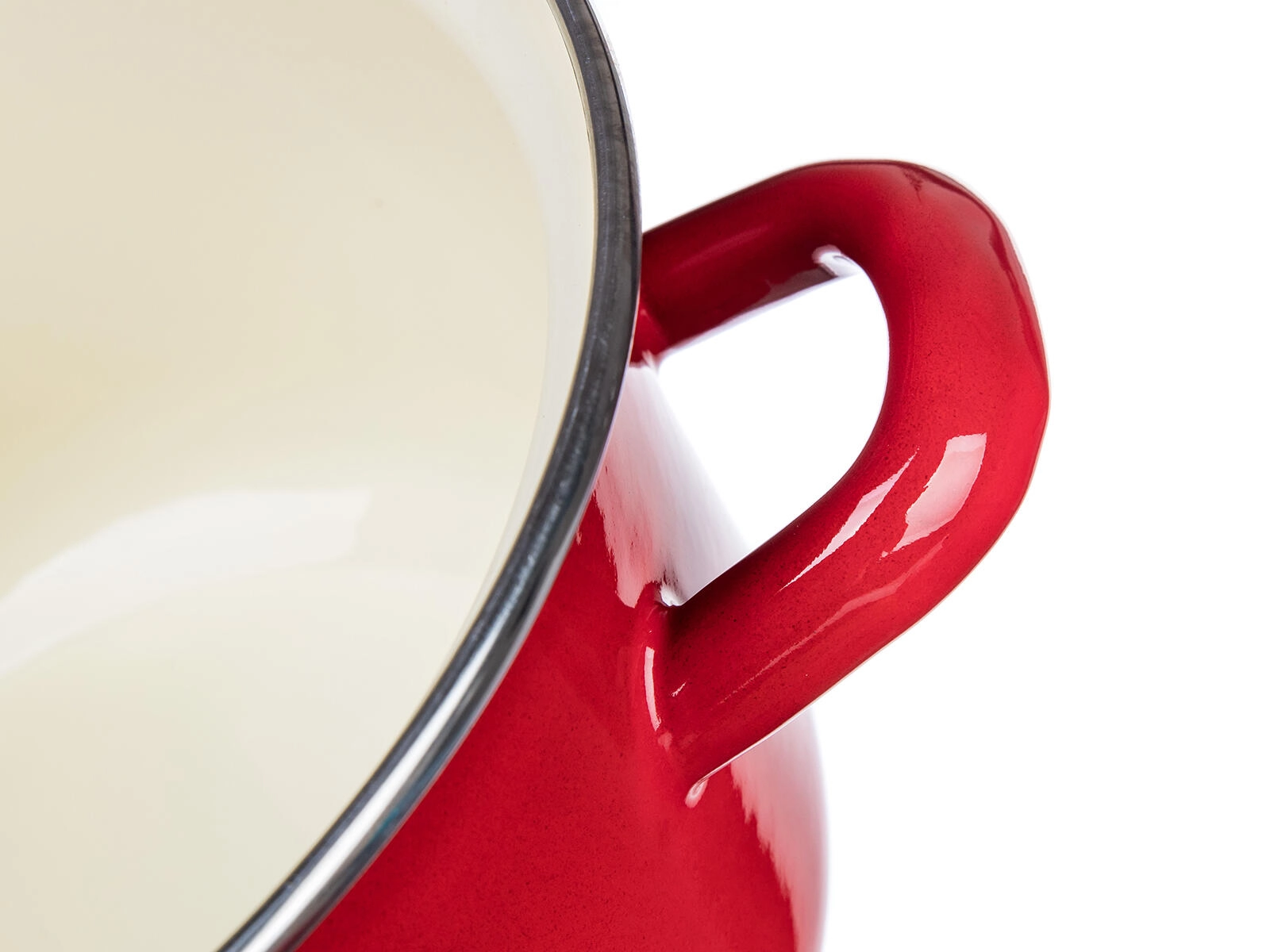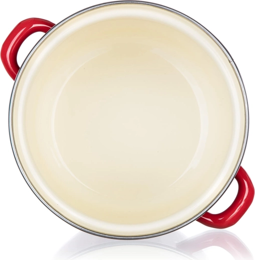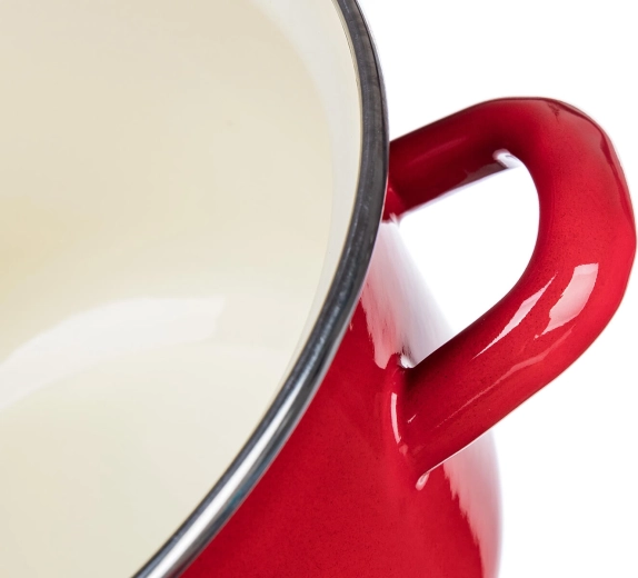 Rote Emaille außen und ein cremefarbenes Inneres widerstehen Flecken und erleichtern die Pflege. Die Oberfläche ist glatt, hygienisch und farbbeständig.
