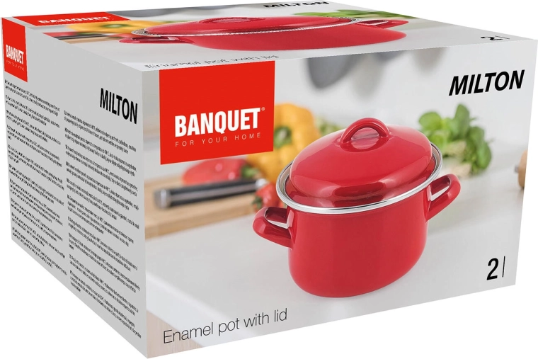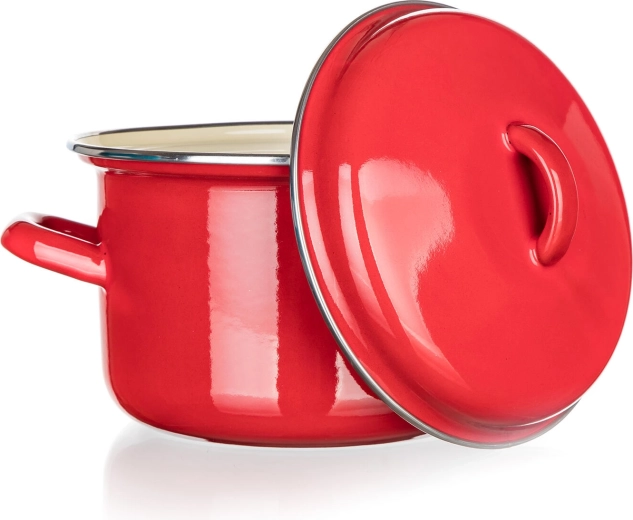 Praktischer emailierter Topf MILTON mit einem Fassungsvermögen von 2 l und einem Durchmesser von 16 cm ist ideal für das tägliche Kochen von Suppen, Saucen und Beilagen. Die strapazierfähige Emaille-Beschichtung in elegantem Rot mit cremefarbener Innenseite lässt sich leicht reinigen und sorgt für eine lange Lebensdauer. Dank der Kompatibilität mit allen Kochfeldern, einschließlich Induktion, ist er ein vielseitiger Helfer für jede Küche.