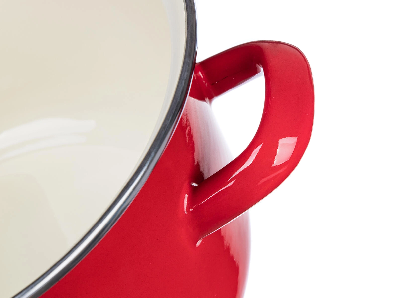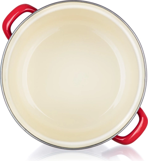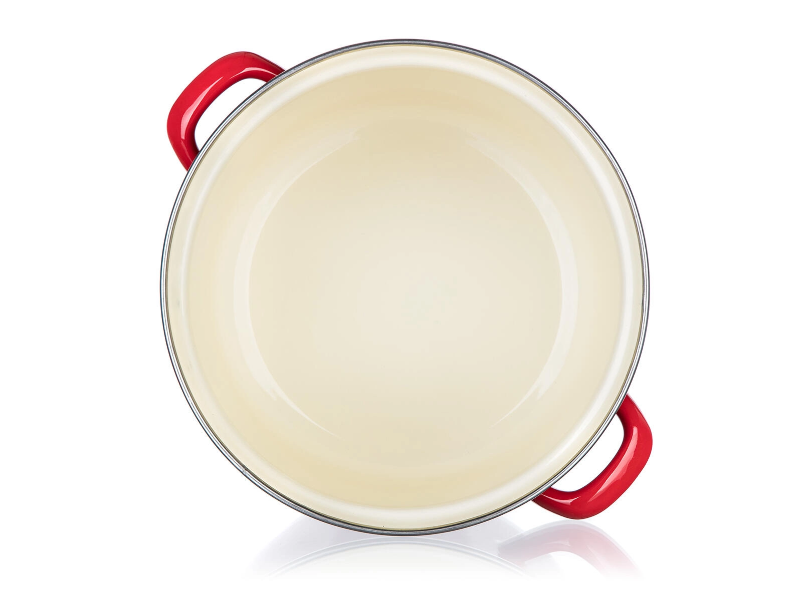 Die elegante rote Glasur mit cremefarbenem Inneren ergänzt jeden Küchenstil und ermöglicht dank des hellen Innenraums eine bessere Kontrolle beim Kochen.
