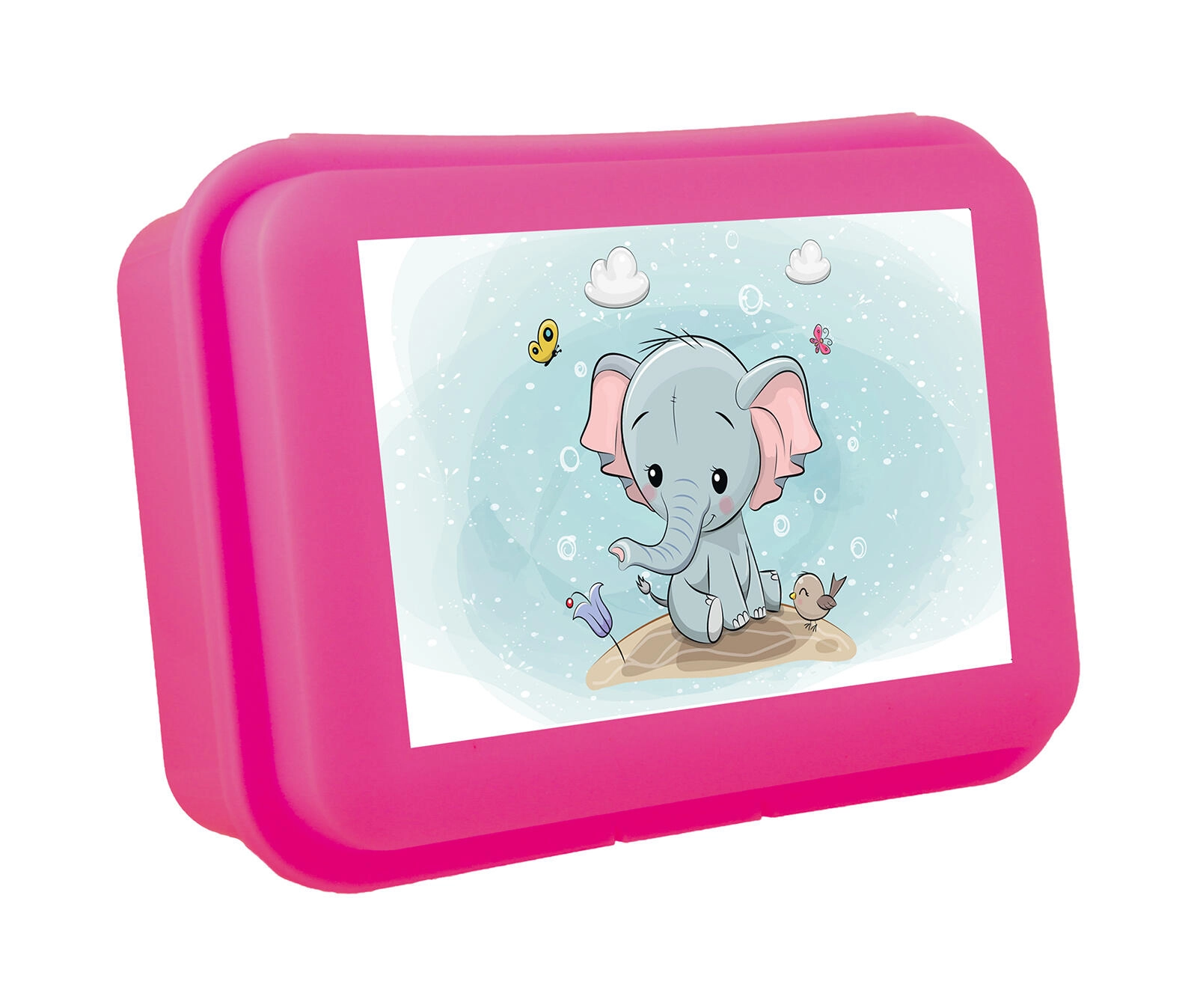 Praktische Brotzeitbox aus robustem Kunststoff mit niedlichem Elefantenmotiv und zuverlässigem Klickverschluss. Ideal für Pausenbrote in Schule, Kindergarten und für unterwegs. Kompakte Maße 16 × 11 × 5,5 cm und leichtes Design im Farb-Mix.