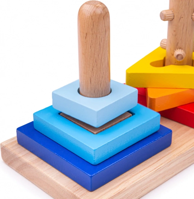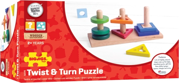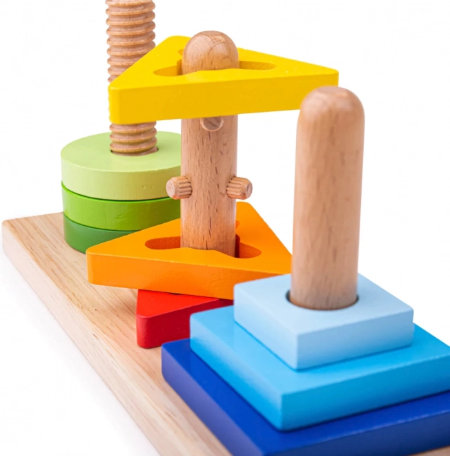 Dieses durchdachte Holzspielzeug motiviert Kinder zum Entdecken. Die Teile werden auf drei unterschiedliche Stifte gesteckt, wobei einige ein Drehen oder die richtige Ausrichtung erfordern. So trainieren Kinder spielerisch die Fingerfertigkeit, Geduld und räumliche Vorstellungskraft.
