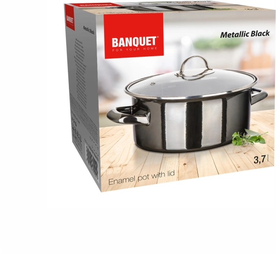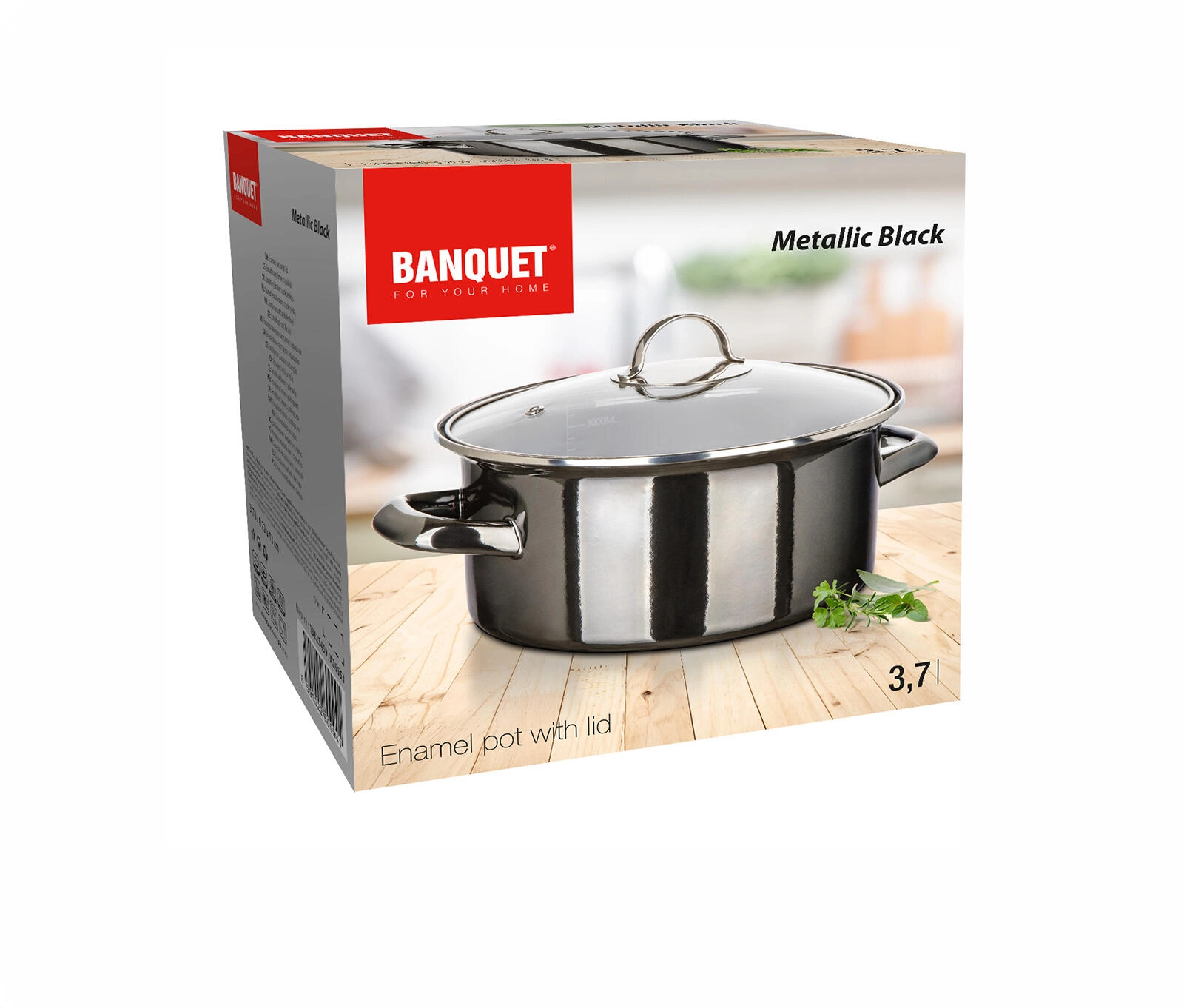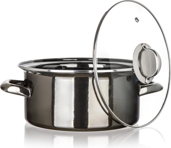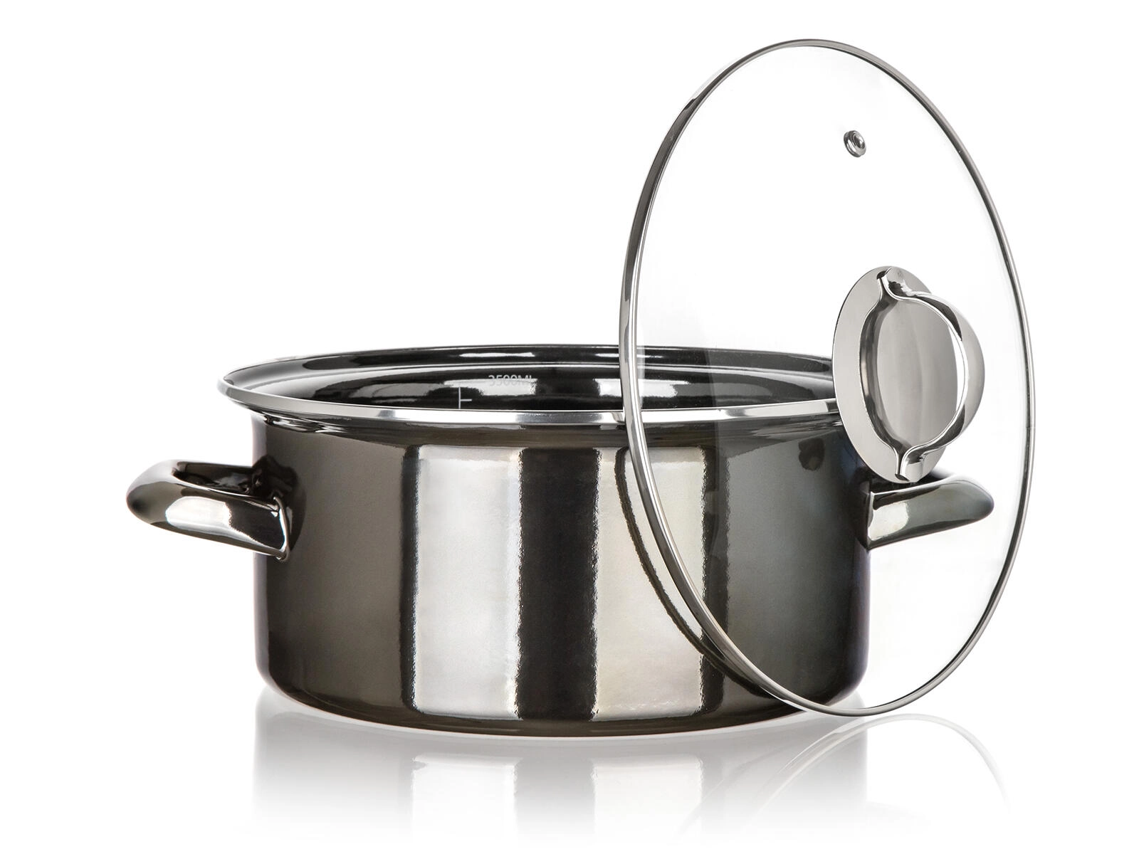 Entdecken Sie einen zuverlässigen Topf für den täglichen Gebrauch im modernen Design Metallic Black. Die emaillierte Oberfläche ist langlebig, leicht zu reinigen und sorgt für eine lange Lebensdauer, während der Glasdeckel ein bequemes Beobachten des Kochvorgangs ohne unnötigen Dampfverlust ermöglicht.