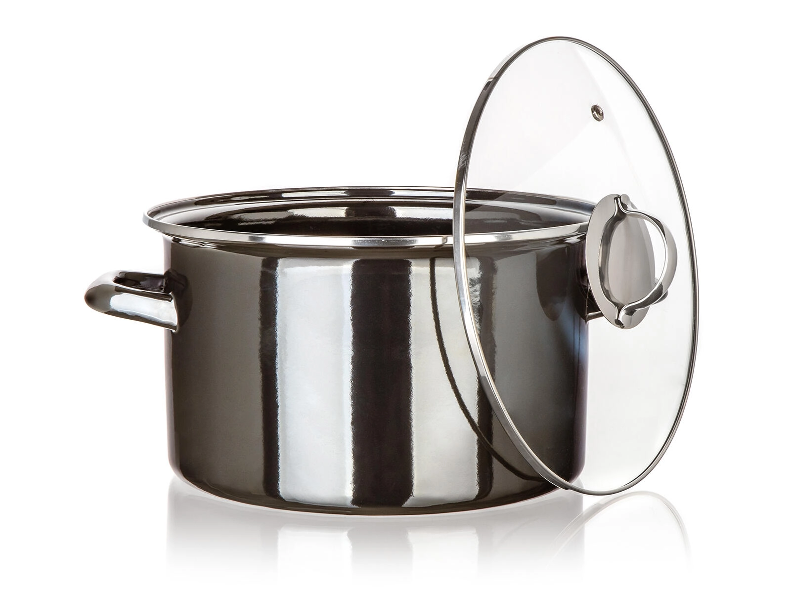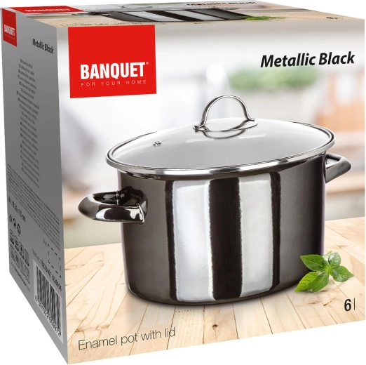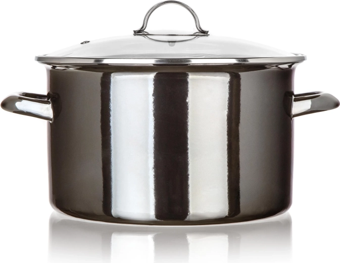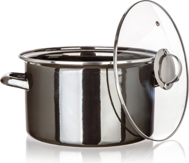 Entdecken Sie einen zuverlässigen emaillierten Topf, der klassisches Design mit moderner Funktionalität verbindet. Die schwarze Metallic-Oberfläche verleiht Ihrer Küche Stil, während der Glasdeckel die Kontrolle über den Kochvorgang ohne unnötiges Anheben ermöglicht. Dank des Fassungsvermögens von 6 l bereiten Sie bequem herzhafte Suppen, Brühen und Familienportionen geschmorter Gerichte zu.