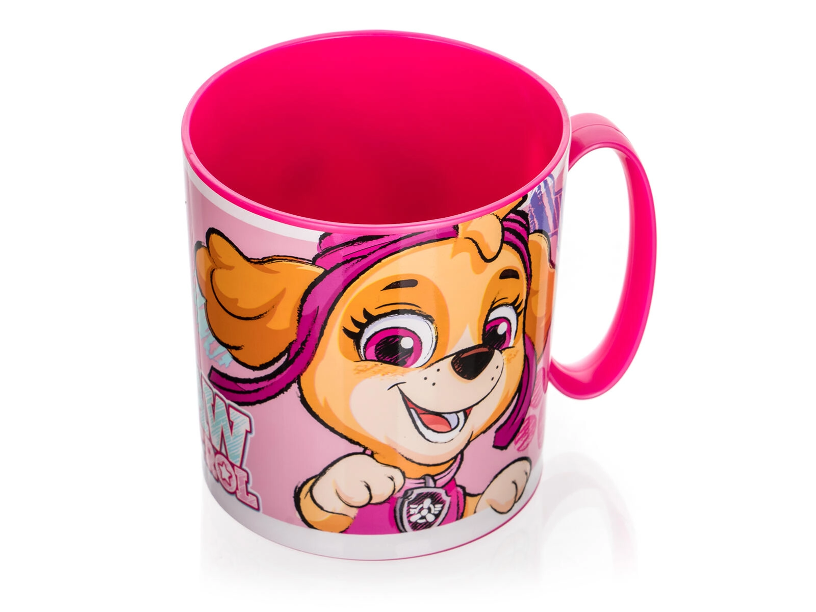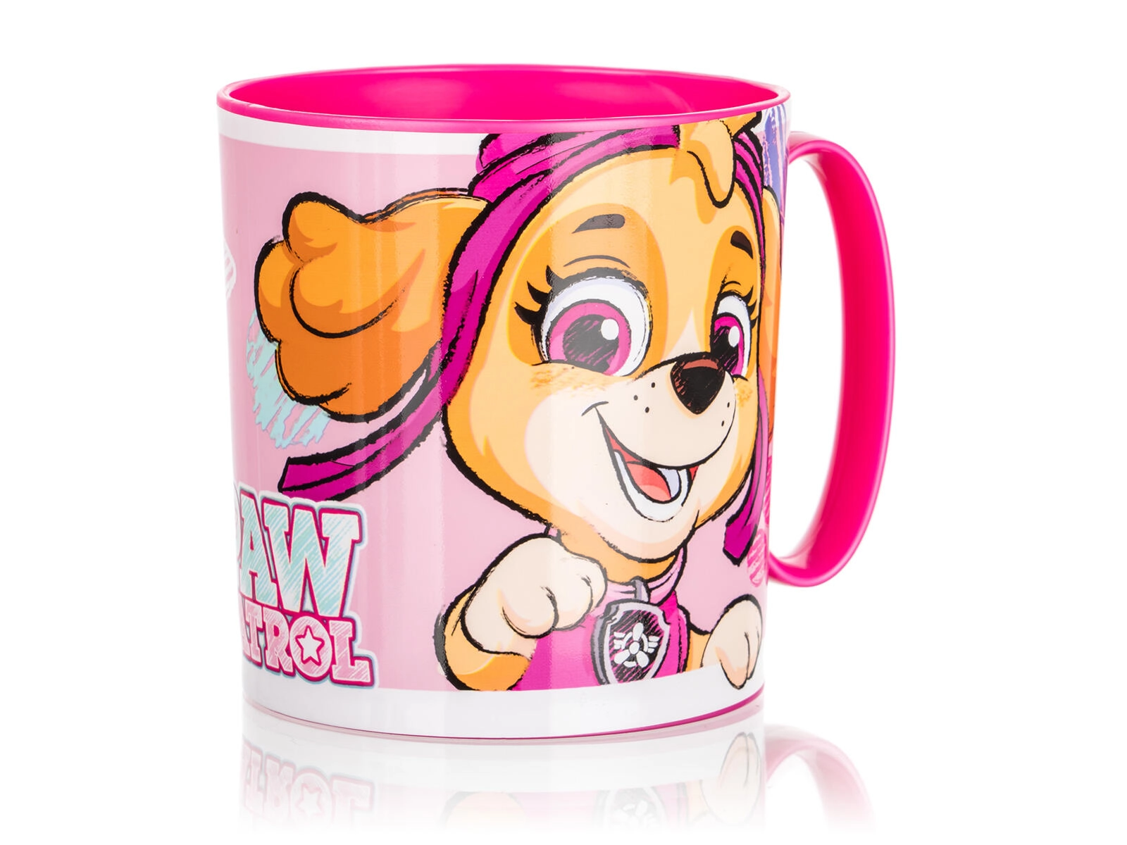 Der Becher hat ein Volumen von 350 ml und ist damit perfekt für Wasser, Tee, Kakao und Saft. Das Material ist sicher und unbedenklich; außerdem lässt sich der Becher kurz in der Mikrowelle erwärmen (max. 2 Min bei 600 W). Das rosa Design mit der fröhlichen Skye-Grafik sorgt für Trinkspaß bei jedem Schluck.