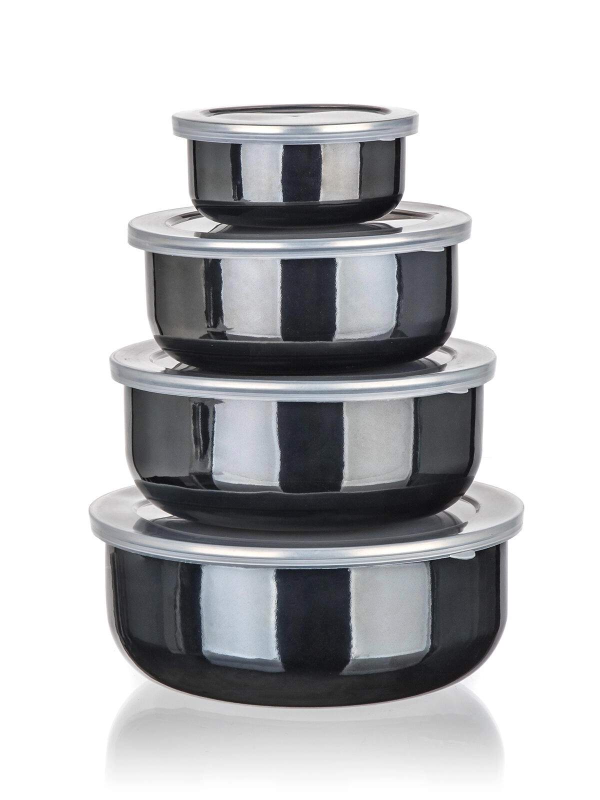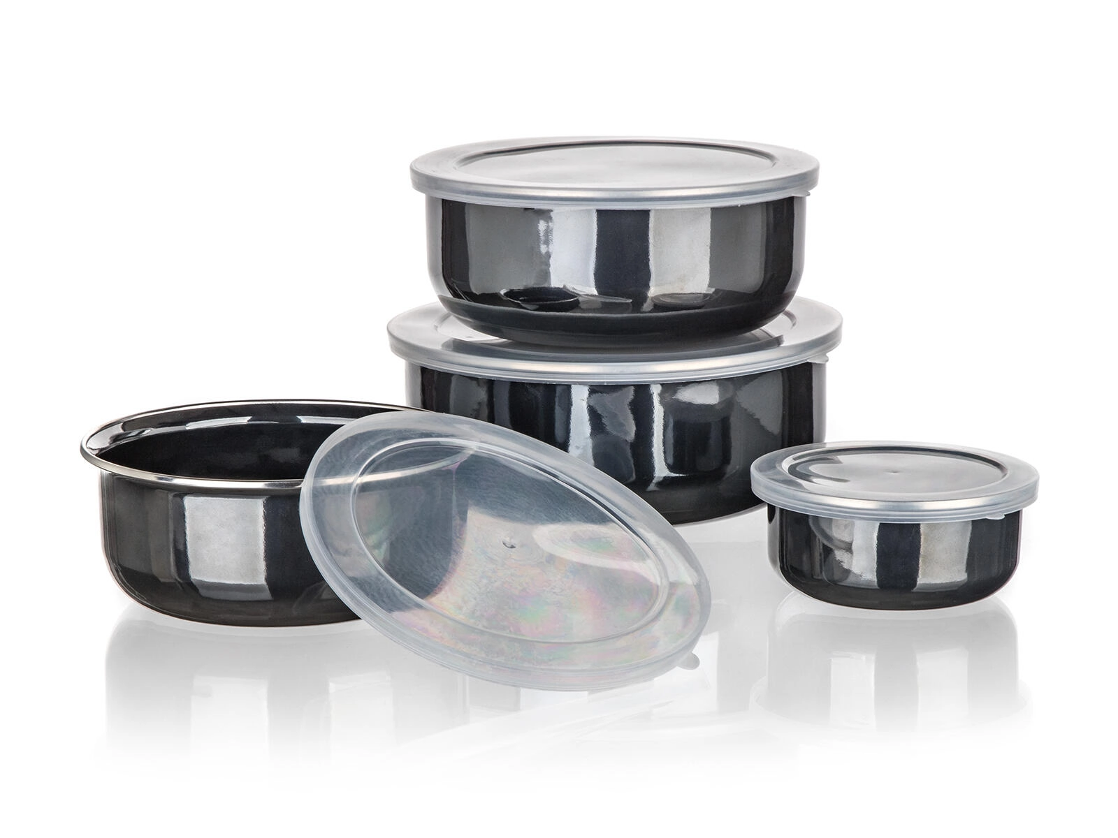 Dieses 8-teilige Schüssel-Set kombiniert eine widerstandsfähige emaillierte Oberfläche mit praktischen Kunststoffdeckeln. Verschiedene Größen decken alles ab – von kleinen Zutaten bis zu Essensresten. Die Schüsseln sind leicht, einfach zu reinigen und sparen dank des stapelbaren Designs Platz im Küchenschrank.