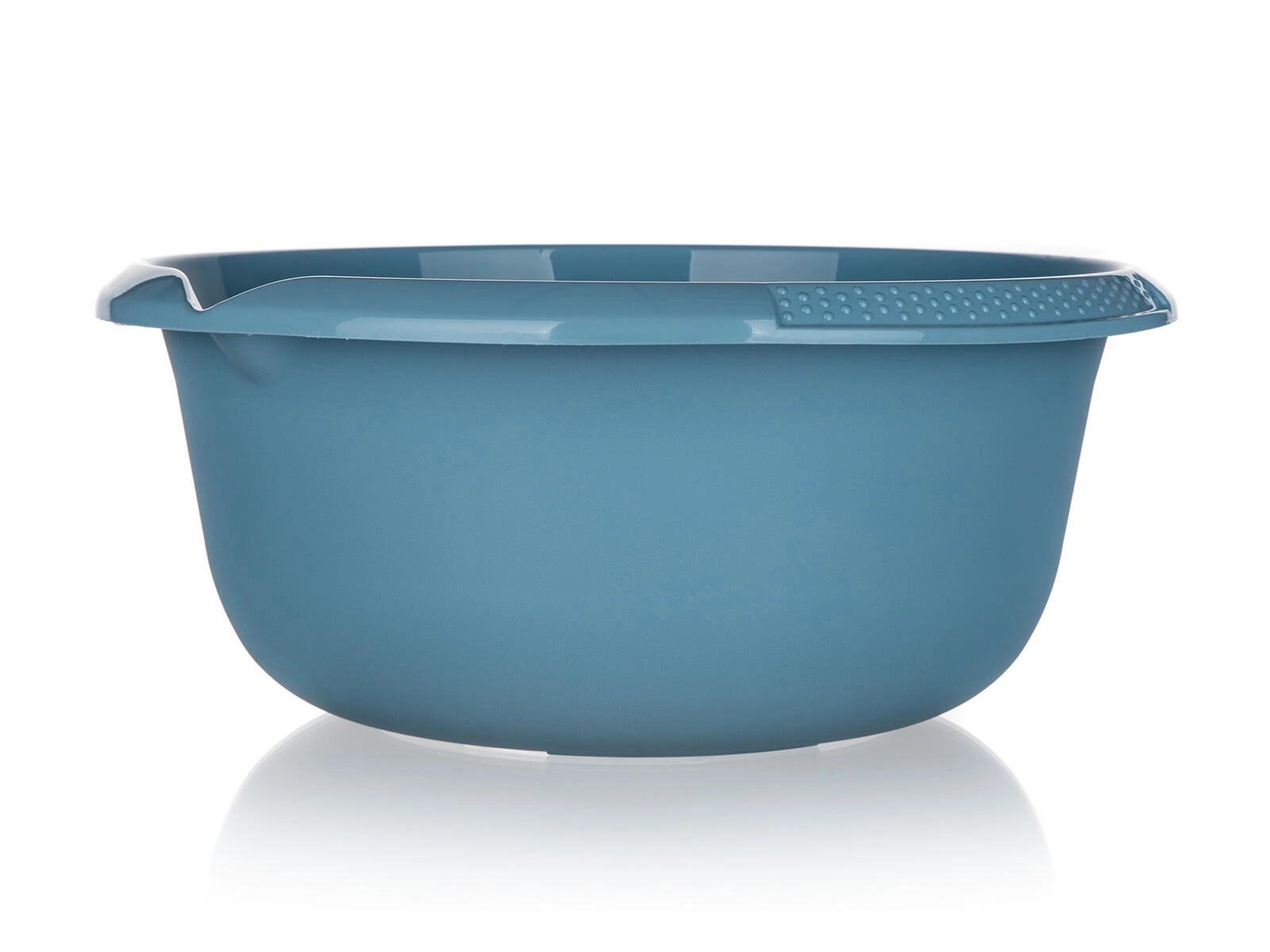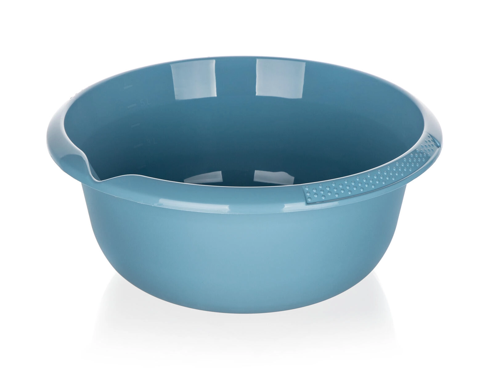 Die zuverlässige blaue Waschschüssel aus hochwertigem Kunststoff erleichtert Ihnen die tägliche Reinigung und Haushaltsarbeit. Dank des praktischen Ausgusses gießen Sie Wasser oder Lösungen bequem um, ohne ungewolltes Verschütten, und der breite, texturierte Rand sorgt für einen sicheren Griff – auch bei voller Befüllung.