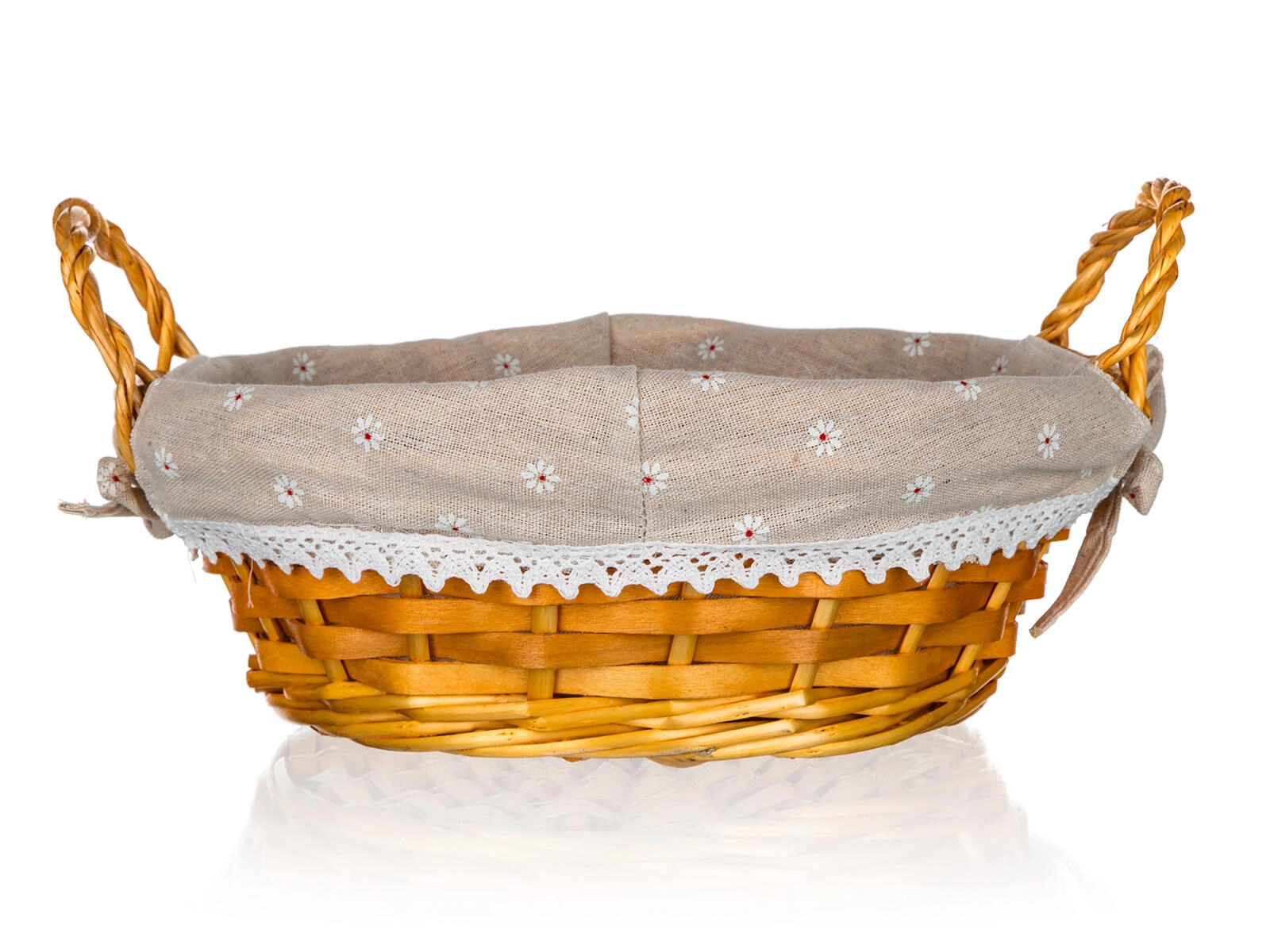 Die Baumwollauskleidung mit kleinen Blüten und Spitzenkante verleiht dem Korb eine romantische Note und schützt die Dekorationen im Inneren.