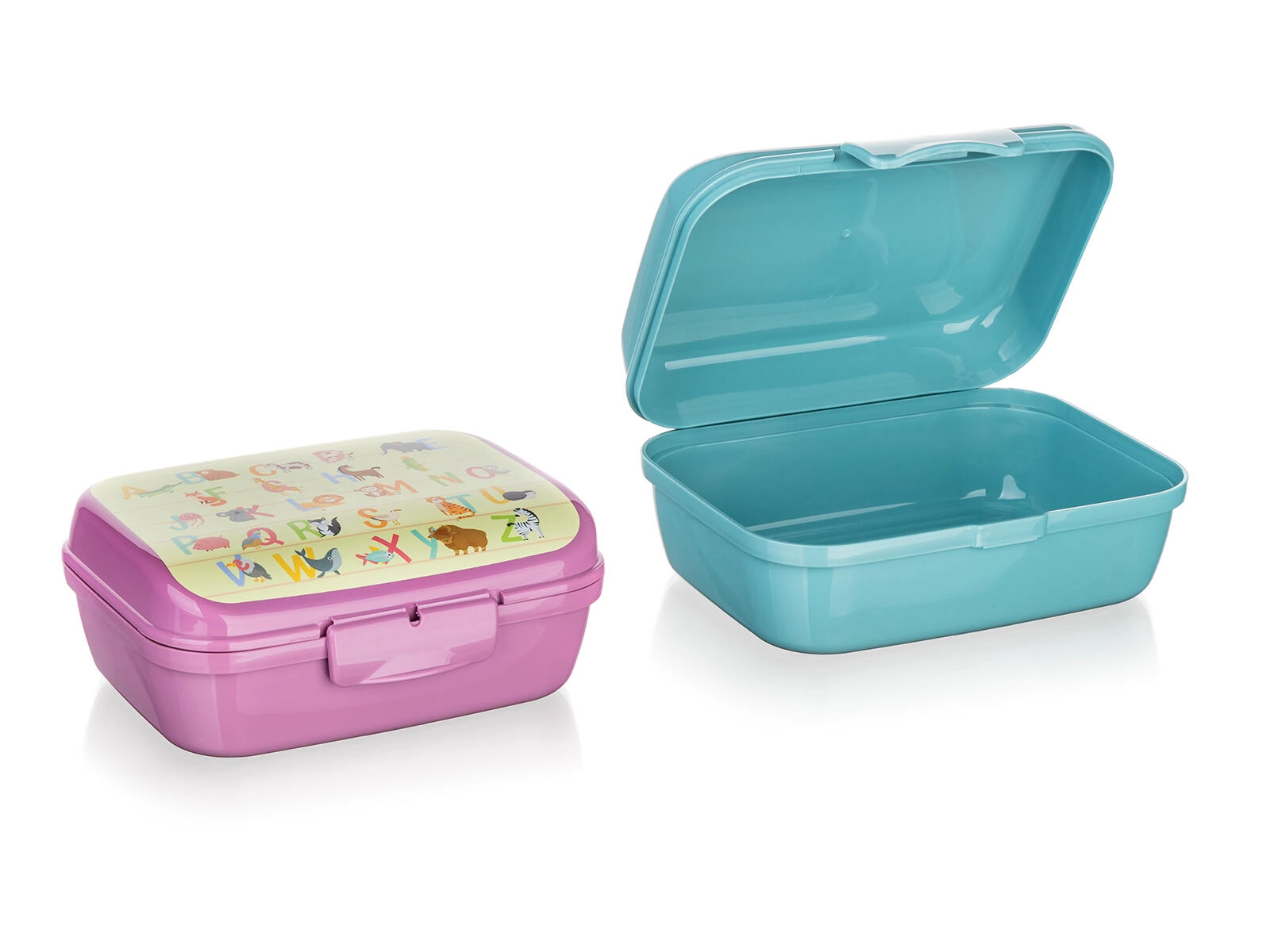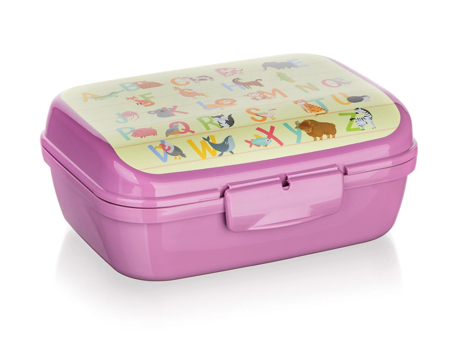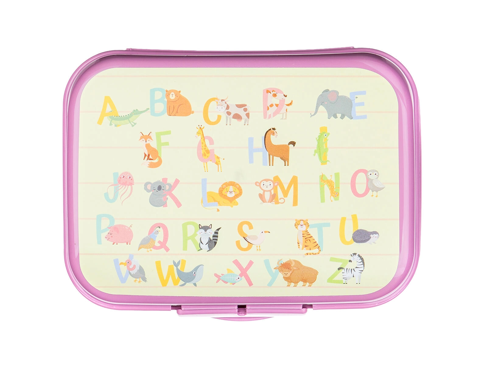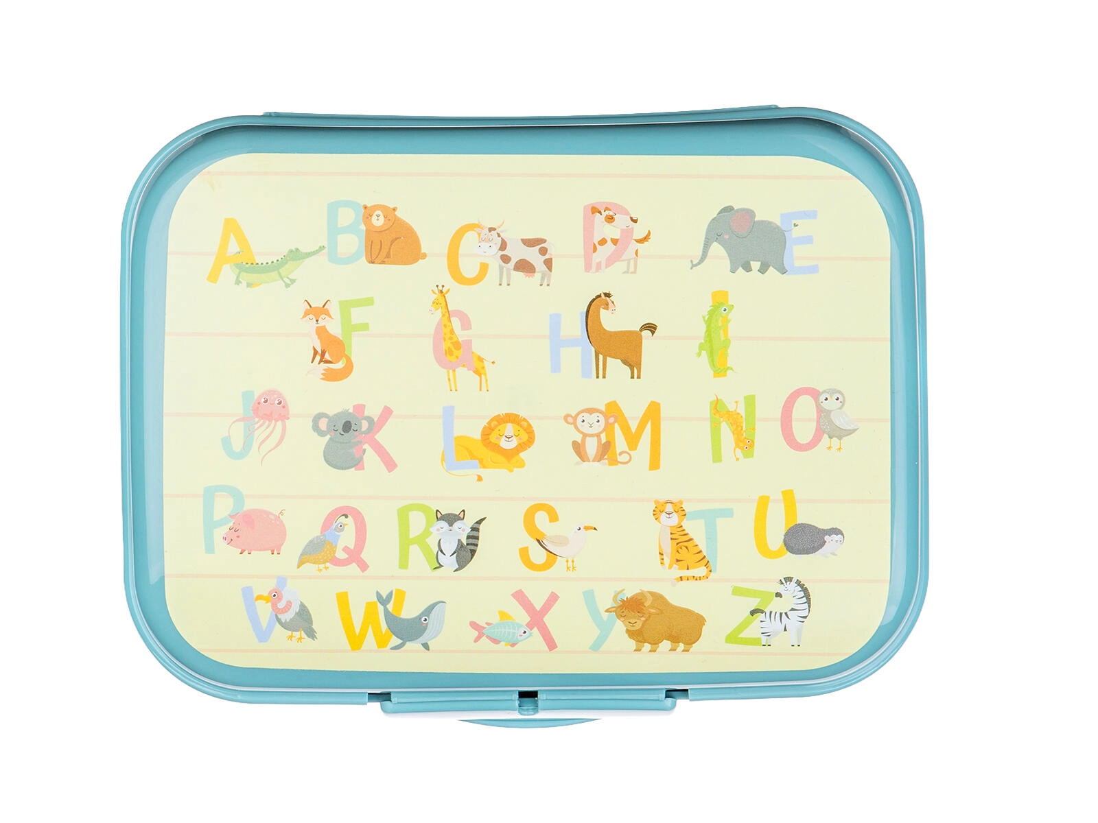 Das bunte Alphabet mit Tieren motiviert Kinder zum Snacken und verleiht der Dose einen verspielten Look.