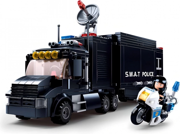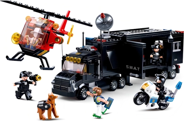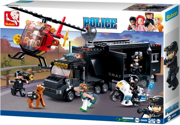 Dieses detailreiche SLUBAN Bauset aus der Polizei-SWAT-Reihe bietet Kindern endlose Spiel- und Baumöglichkeiten. Die Hauptrolle spielt die robuste mobile Einsatzzentrale – ein schwarzer Lkw mit vielen realistischen Details – ergänzt durch einen Hubschrauber für Luftoperationen und ein schnelles Polizeimotorrad für die Verfolgung von Dieben. In der Packung finden Sie 5 Figuren und umfangreiches Zubehör, das spannende Geschichten und kreative Szenarien unterstützt.