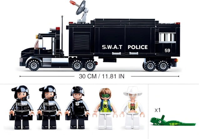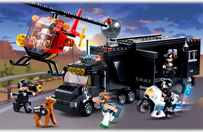 Das Herzstück des Sets ist ein schwarzer SWAT-Lkw – eine mobile Einsatzzentrale mit realistischen Details, die als Zentrale für alle Polizeieinsätze dient. Ideal für taktische Verlegungen und die Einsatzplanung.