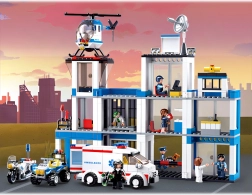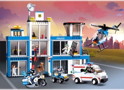Polizeistation, Helikopter, Motorrad, Rettungsfahrzeug, 7 Minifiguren, Anleitung