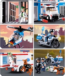 Enthalten sind ein Helikopter, ein Polizeimotorrad und ein Rettungsfahrzeug. Kinder können wagemutige Einsätze und rasante Verfolgungsjagden planen und spannende Szenarien rund um den Gefängnisausbruch erschaffen.