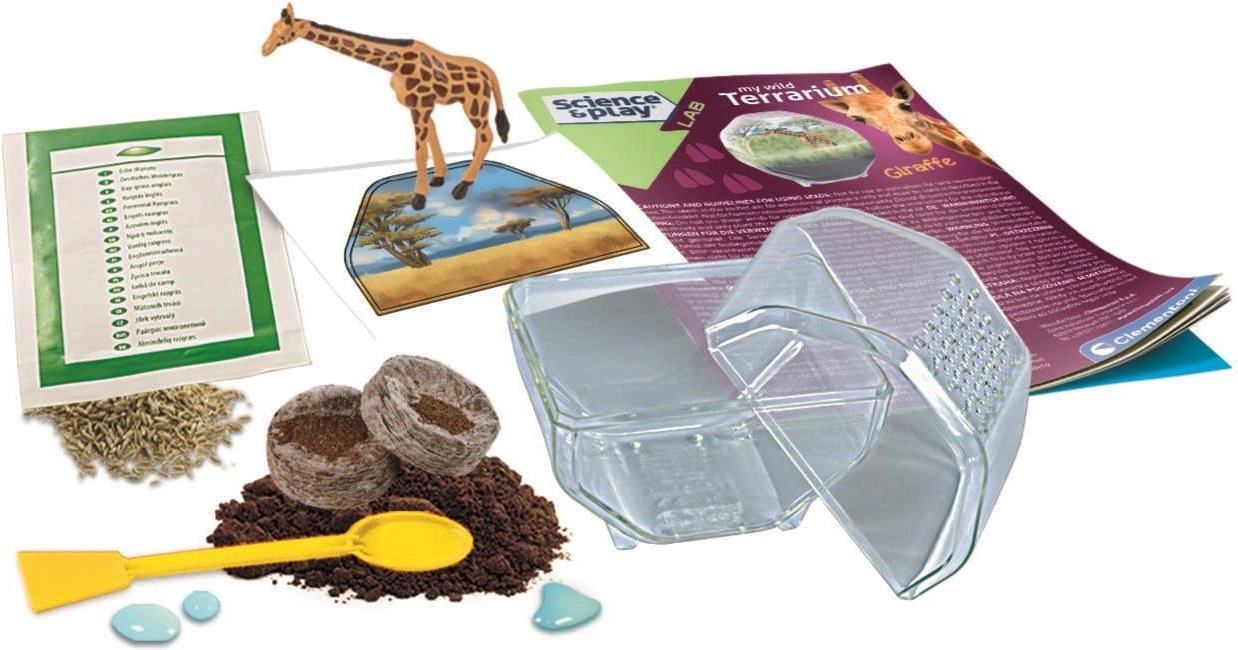 Das Mini-Terrarium mit Giraffe von CLEMENTONI bietet Kindern eine interaktive Möglichkeit, die Natur und die Prinzipien des Pflanzenwachstums kennenzulernen. Die transparente Dose mit Lüftungsöffnungen ermöglicht eine einfache Beobachtung des Keimens und der Entwicklung des Grüns, während die realistische Giraffenfigur und der thematische Hintergrund ein kleines Stück Savanne direkt ins Kinderzimmer zaubern.