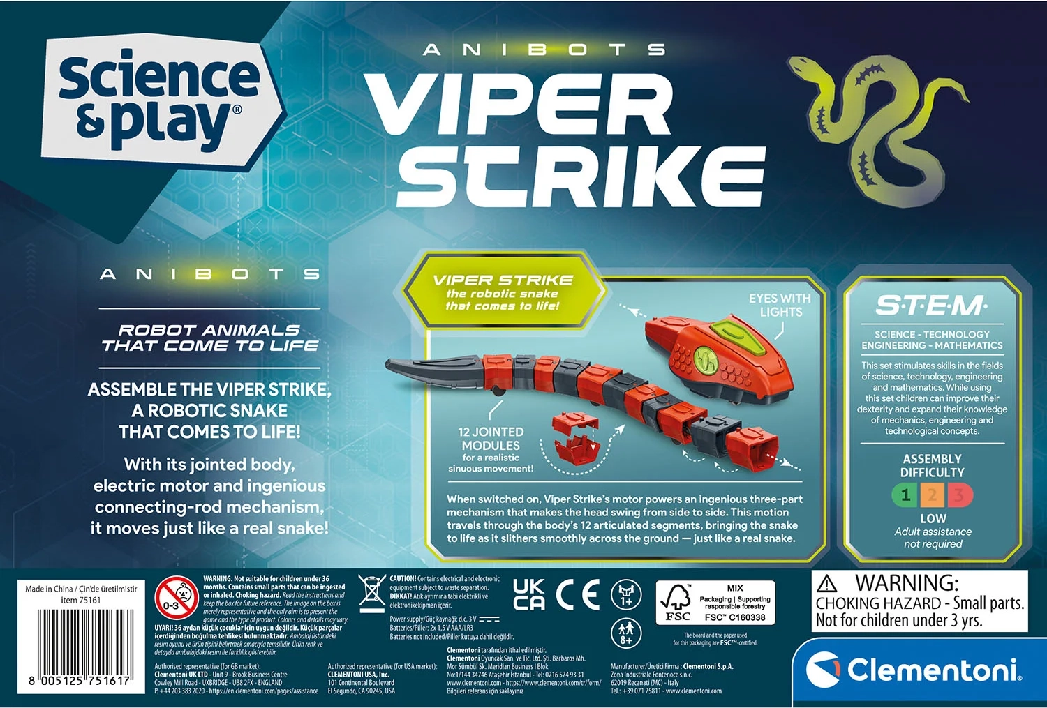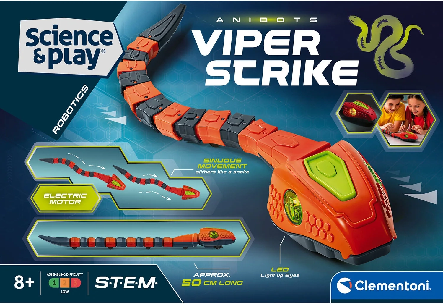 Viper Strike ist ein interaktiver, von der Tierwelt inspirierter Roboter, der Kindern auf spielerische und anschauliche Weise die Prinzipien von Mechanik, Elektronik und algorithmischem Denken näherbringt. Dank der segmentierten Bauweise und einfachen mechanischen Interaktionen sehen Kinder, wie die einzelnen Teile zusammenwirken und eine fließende, schlangenartige Vorwärtsbewegung erzeugen.