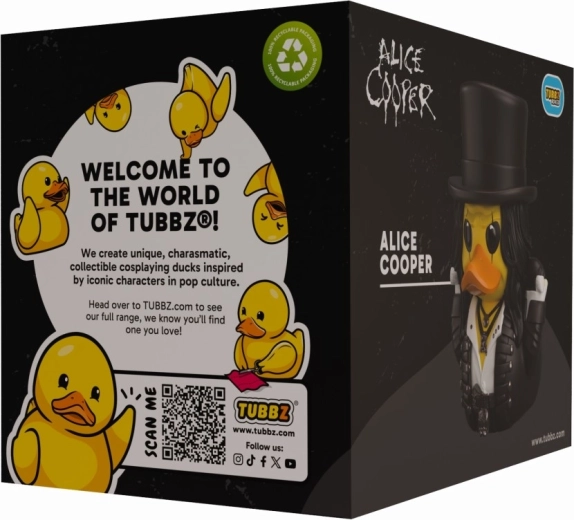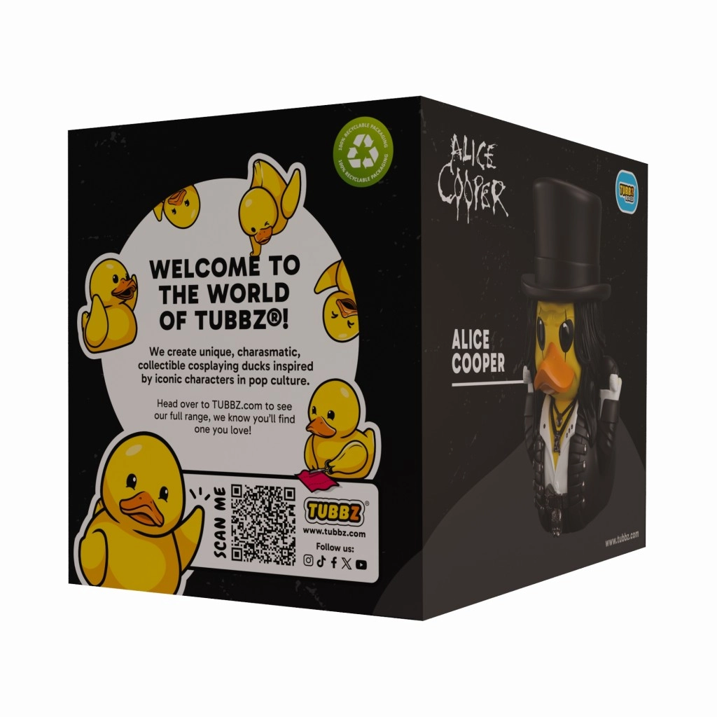 Entdecken Sie die originelle Sammlerfigur Tubbz in Form einer klassischen Gummiente, die die Persönlichkeit von ALICE COOPER getreu widerspiegelt – vom markanten Make-up bis zu den dunklen Rock-Elementen des Outfits. Robustes Vinyl sorgt für lange Haltbarkeit und präzise Details begeistern jeden Fan.
