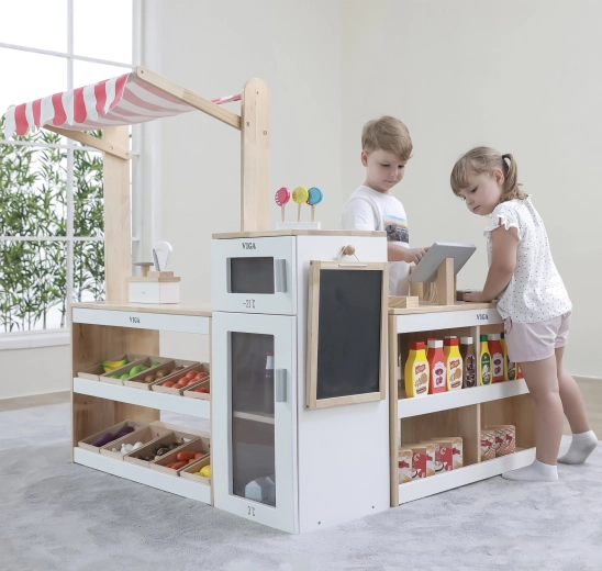 Das großzügige Set Viga XXL eignet sich ideal für das heimische Spielzimmer und den Kindergarten. Kinder üben Einkaufen, Kassenbedienung und das Sortieren von Waren. Durch die durchdachte Aufteilung mit Regalen, Tresen und seitlichem „Kühlschrank“ bleibt das Spiel übersichtlich und langfristig spannend. Die stabile Holzkonstruktion und die hochwertige Oberflächenbehandlung garantieren Sicherheit und Langlebigkeit.
