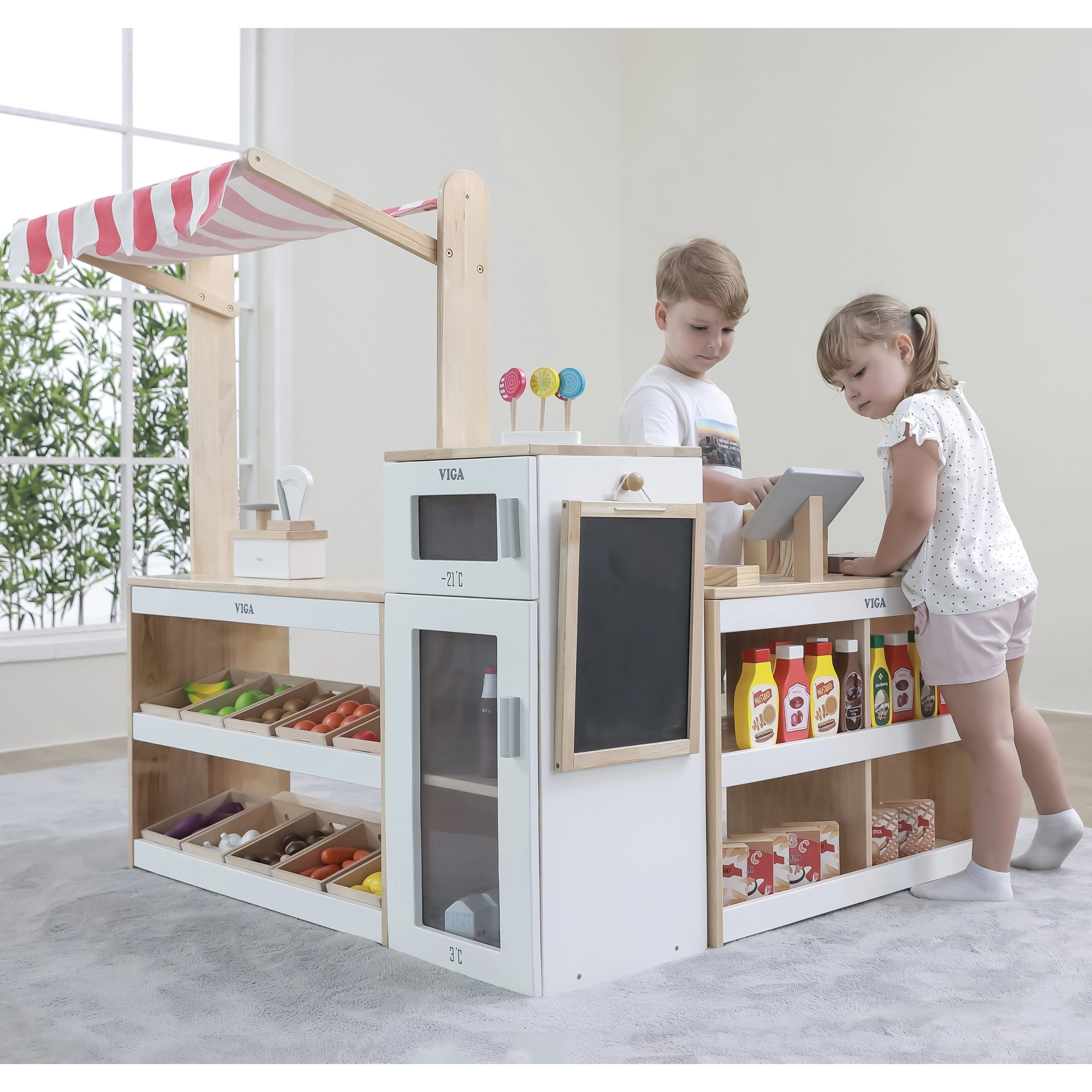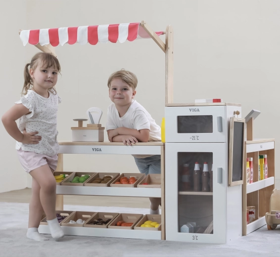 Entdecken Sie den großen hölzernen Verkaufsstand Viga XXL, der das Kinderzimmer in einen fantasievollen Supermarkt verwandelt. Das realistische Design mit Verkaufstresen, Kühlschrank mit Gefrierfach, Kreidetafel und Aufbewahrungskörben fördert das kreative Rollenspiel von Verkäufer und Kunde und entwickelt Kommunikation, Rechnen sowie Zusammenarbeit. Hergestellt aus sicherem Holz mit ungiftigen Farben.