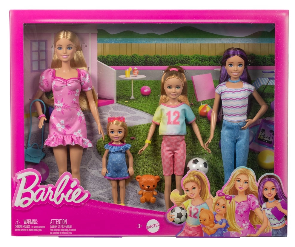Barbie im rosa Kleid, Skipper mit Tablet, die sportliche Stacie mit Ball und die verspielte Chelsea mit Teddybär – vier unterschiedliche Charaktere für endlose Szenarien.