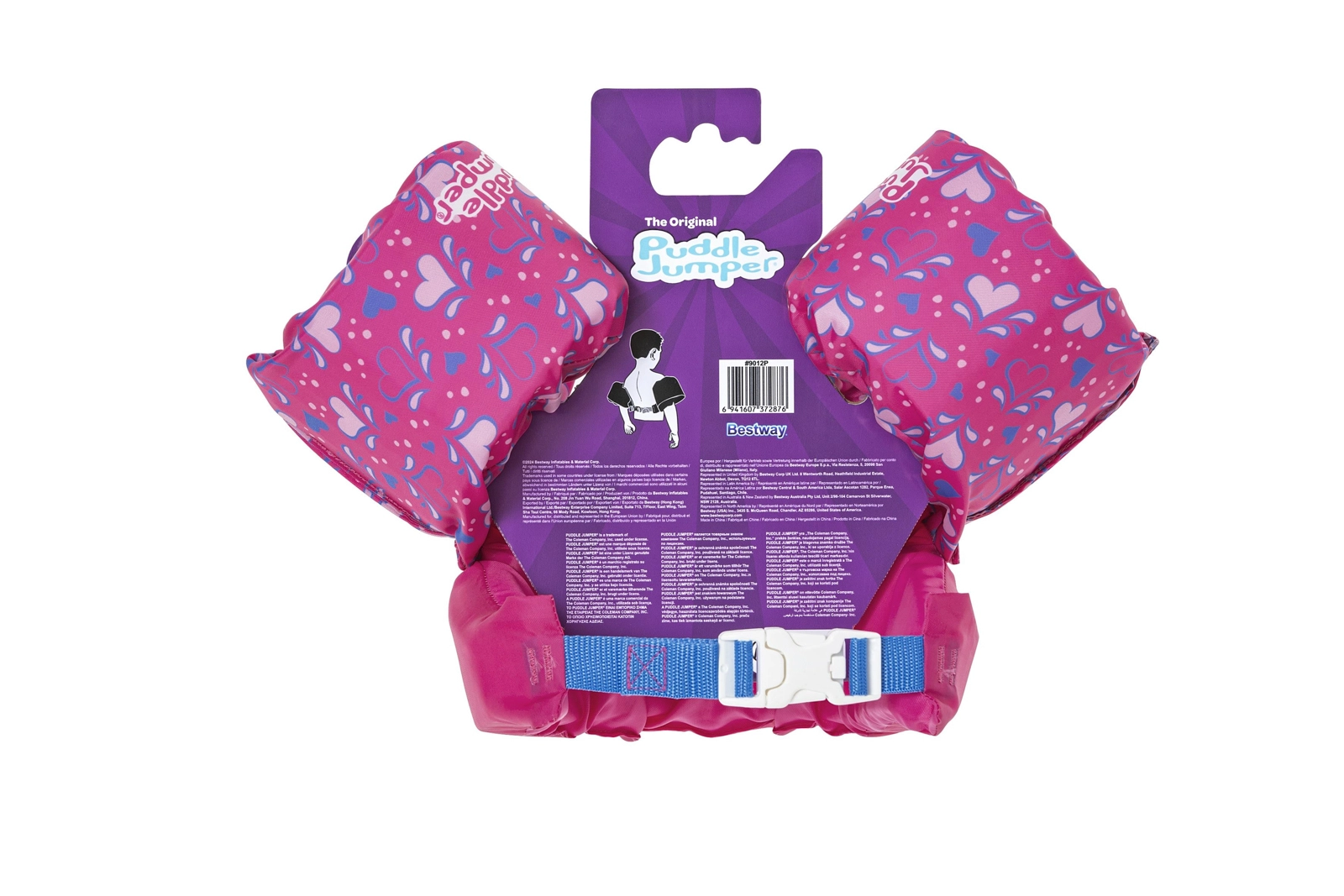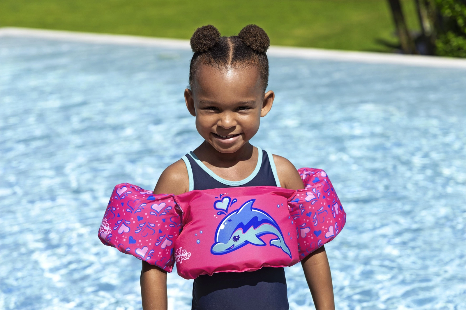 Die ideale Hilfe für die ersten Schritte im Wasser: Der Puddle Jumper hält das Kind in einer natürlichen Schwimmposition und erleichtert das Üben von Beinschlägen und Gleiten. Der strapazierfähige Textilbezug aus glattem Polyester ist angenehm auf der Haut und reduziert Scheuerstellen, während der Schaumkern zuverlässigen Auftrieb bietet – ganz ohne Aufpumpen.